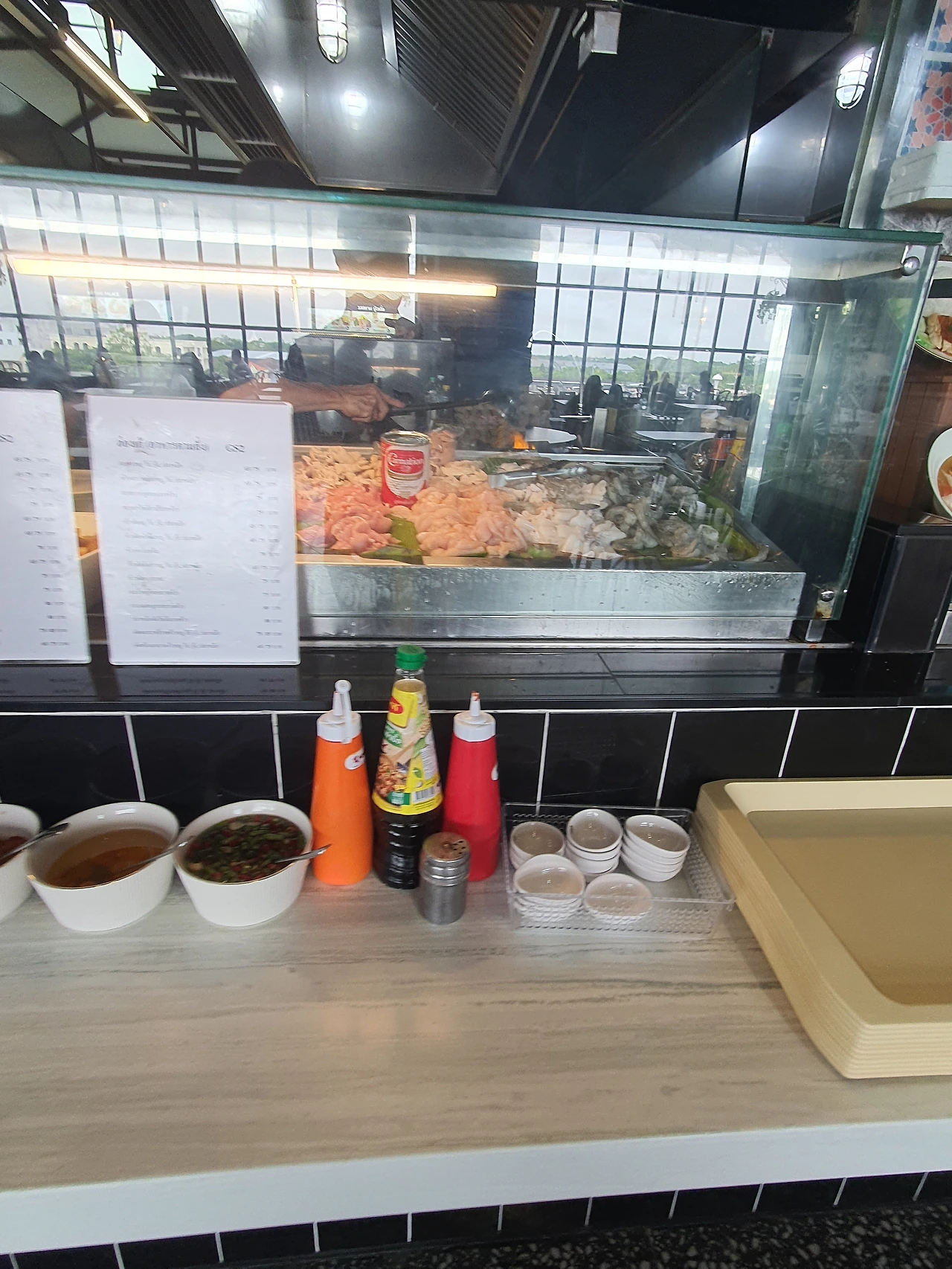 잘 요리된 계란프라이만으로 원하는 불맛을 기대하며 덮밥 종류인 태국식 새우카레(85밧)를 주문해 보았다. 물론 먹음직스럽게 요리된 튀긴 계란(10밧)도 함께하니 95밧(3,800원)이다. 푸트코트의 식당은 주로 2인 1조로 보조하는 1명이 주문을 받고 메뉴에 들어가는 식재료를 접시에 담아 순서대로 조리대에 올려놓는다. 요리사는 메뉴를 보고 담긴 재료를 이용해 요리를 5분 이내에 만들어 낸다.