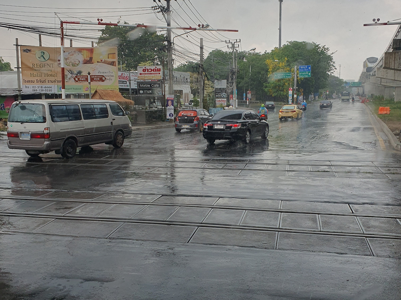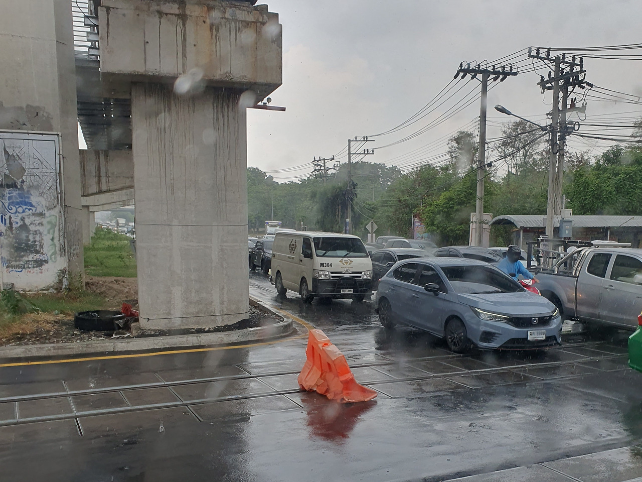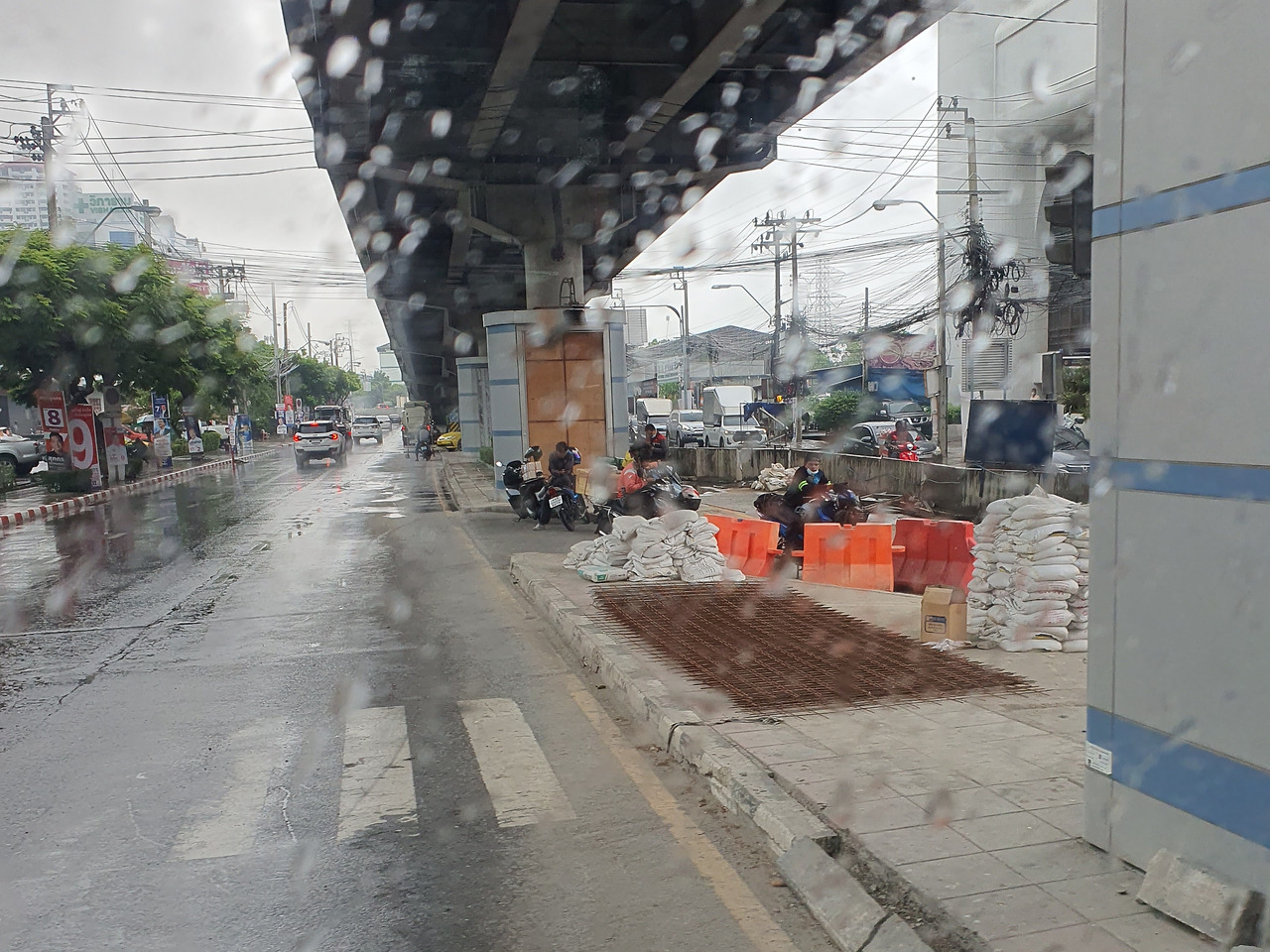 구슬만 한 빗방울이 본격적으로 땅을 울리며 대지의 열기와 함께 폭풍 속 백파처럼 사방으로 부서진다. 공사장 인부들은 건설 중인 브리지를 지붕 삼아 비를 피해 앉아 자연이 주는 짧은 휴식에 땀을 식힌다. 교통정리를 하던 경찰도 차광을 위해 펼쳐둔 파라솔 밑에서 비를 피한다.