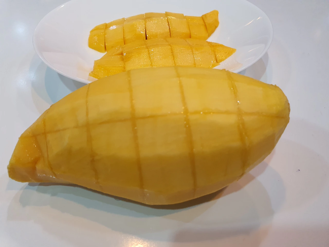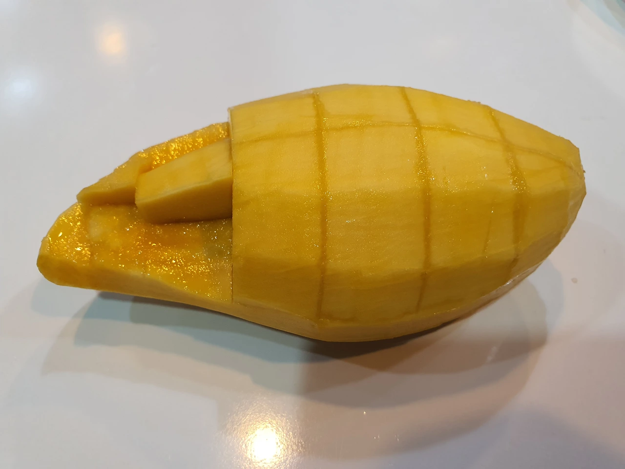 망고에 손을 최대한 대지 않고 깔끔하게 잘 먹을 수 있는 방법이 없을까. 망고 자르는 대표적인 방법은 껍질채 납작한 씨를 기준, 반으로 자른 후 속살을 한입크기로 칼집을 내어 입으로 발라먹는 방법. 숙성되어 껍질과 과육이 잘 분리되는 익은 망고가 적합하다. 하지만 단단한 과육으로 껍질과 잘 분리되지 않는 망고는 사과 깍듯 망고껍질을 잘라내고 단단하고 넓적한 씨를 접시 삼아 세로로 깍둑썰기한 후 씨를 경계로 가로로 자르면 버리는 부분 없이 과육만 깔끔하게 먹을 수 있다.