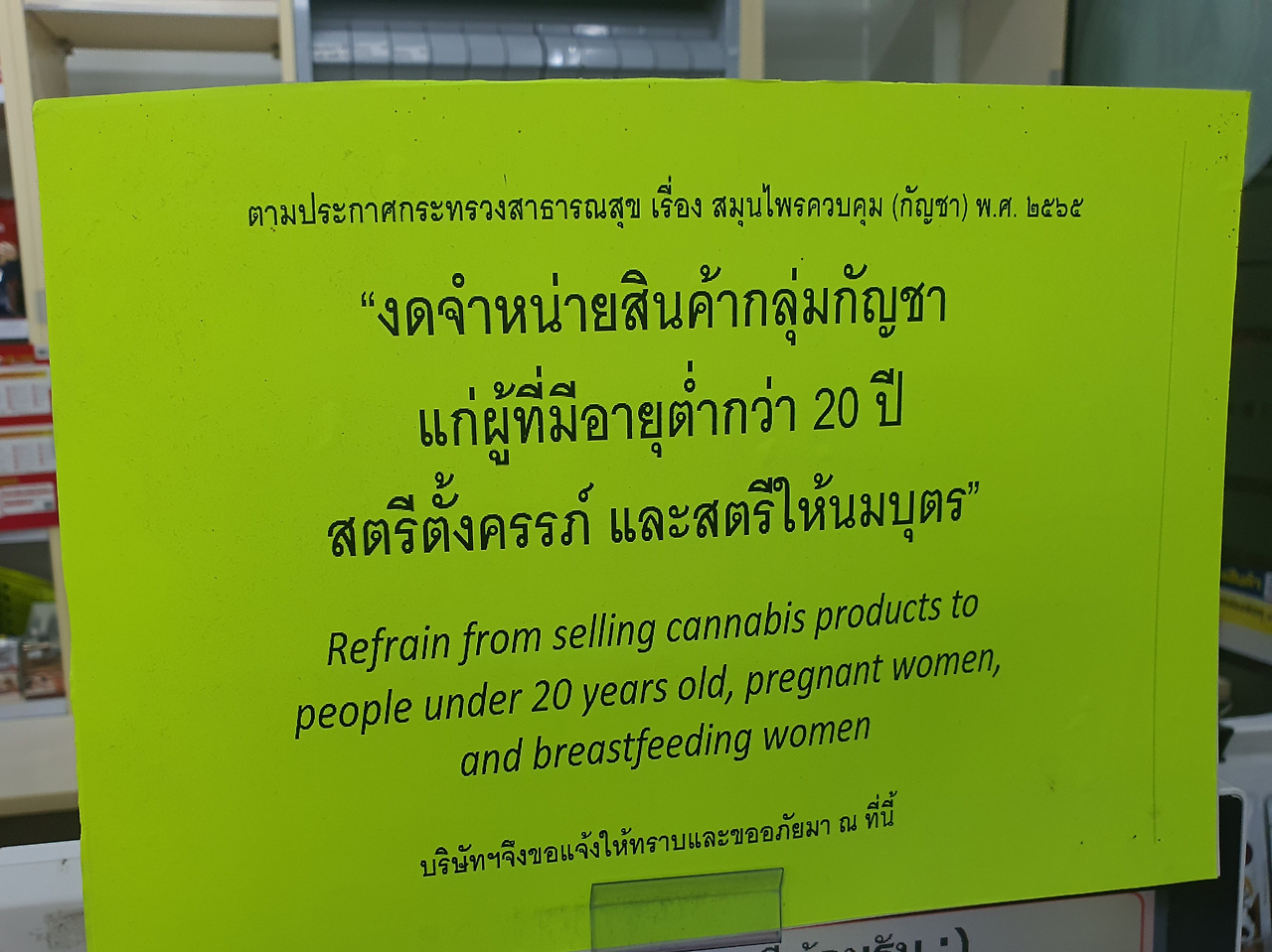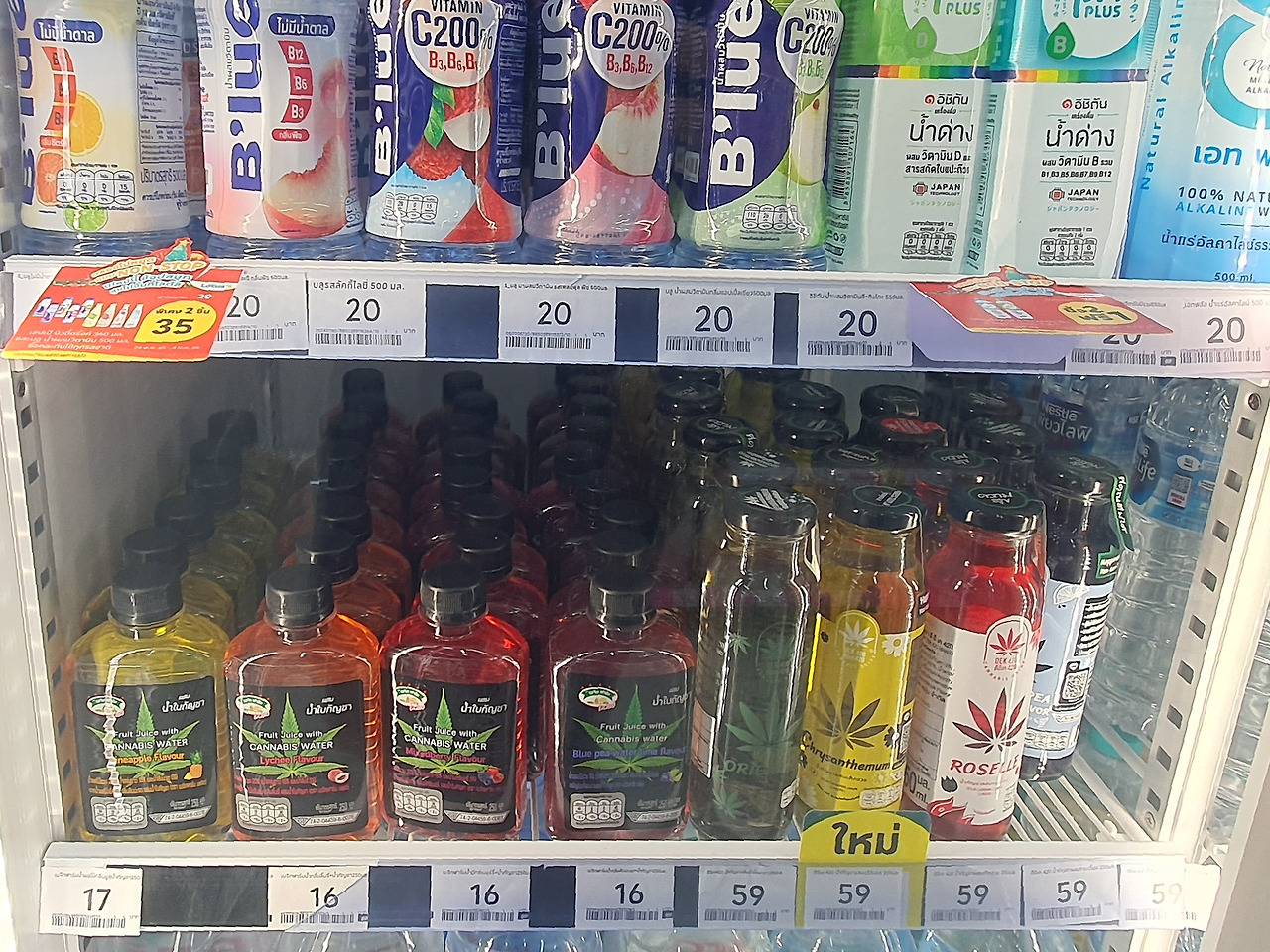 태국 마트에서는 녹색 대마잎이 그려진 대마음료가 일반 음료와 함께 판매되고 있다. 대마의 종류(카나비스, 마리화나, Weed, Grass, 칸차, 칸총 등)도 다양할 뿐 아니라 심지어 일반 주스에 대마음료를 혼합하여 판매하고 있는 경우도 있다. 비록 20세 미만, 임산부 등에게 판매하지 않는다지만 소비를 장려하는 느낌을 지울 수 없다.