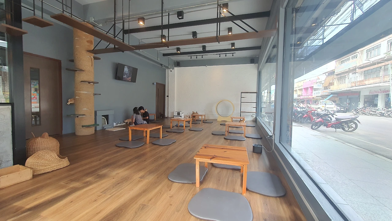 카페는 커피만의 공간이 아닌 휴식과 위로의 공간으로 다양한 주제로 사람들을 불러 모은다. 동물을 사랑하는 태국 사람들. 치앙라이에도 고양이카페가 있다. 버스터미널 인근 8마리의 고양이가 편하게 쉬고 있는 모습이 너무 귀여워 지나가는 사람의 눈길을 사로잡는다.