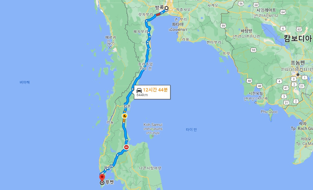석양이 아름다운 곳 하면 당장 떠오르는 곳이 태국 남부 서쪽 해안. 지도를 검색해 태국 남서부 해안을 검색해 본다. 푸껫? 말로만 듣던 푸껫이 태국 남부에 있었다니. 거리를 보아하니 방콕에서 850km 떨어져 있으며 차량으로는 12시간이 넘게 걸린다.