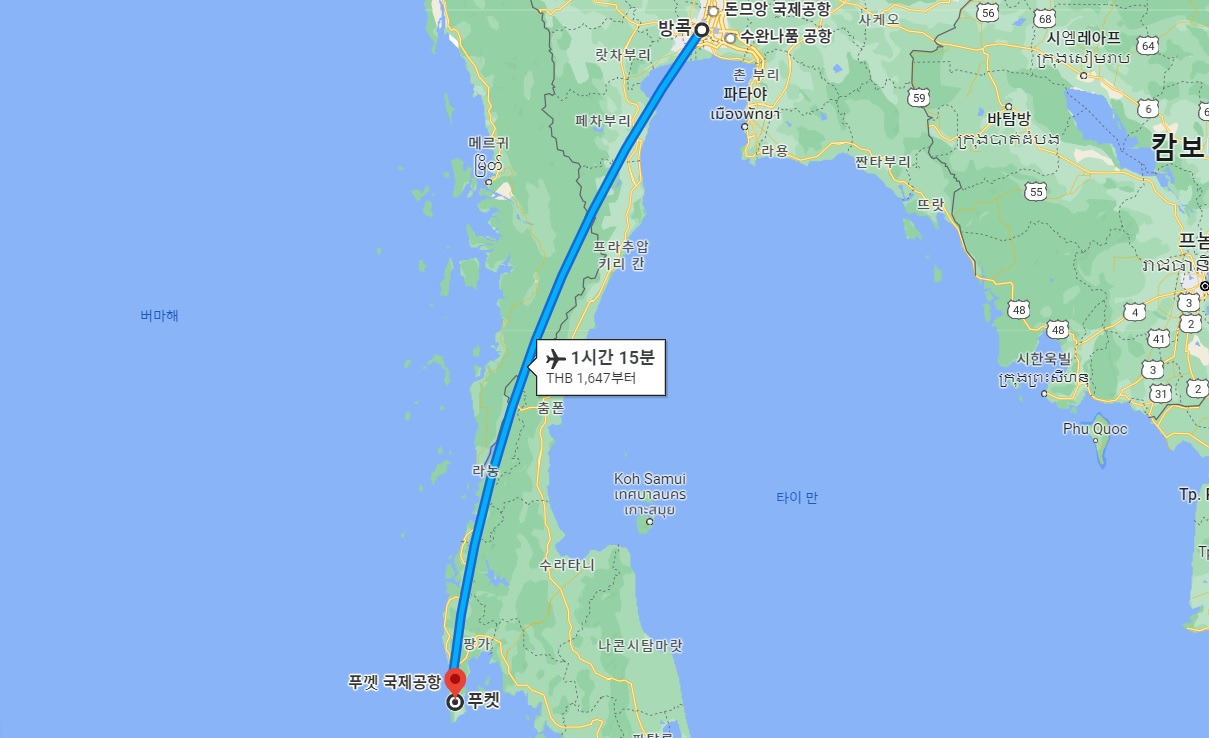 방콕 - 푸껫 비행시간 (구글 지도 캡처)