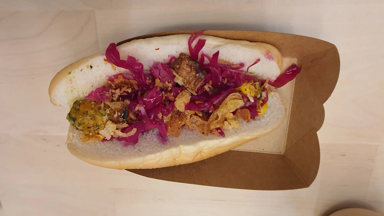 어니언 칩, 콩고기, 야채가 들어가 있었고 번은 익숙한 폭신한 핫도그 번이다. 예상한 대로 역시 콩고기에서 태국의 똠양의 향이 난다. 하지만 약하게 나는 터라 충분히 먹을 수 있었다.