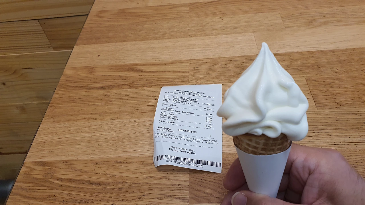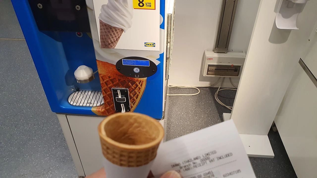 간단하게 애피타이저, 아이스크림으로 시작한다. 가격은 8밧(320원), 카운터에 돈을 내면 토큰과 콘과자를 준다. 콘과자를 자판기 틀에 끼우고 토큰을 넣고 버튼을 누르니 아이스크림이 자동으로 나온다. 하지만 사진과 달리 양이 너무 작다. 하긴 고작 300원짜리 아이스크림에 큰 자비라도 바라는 것일까.