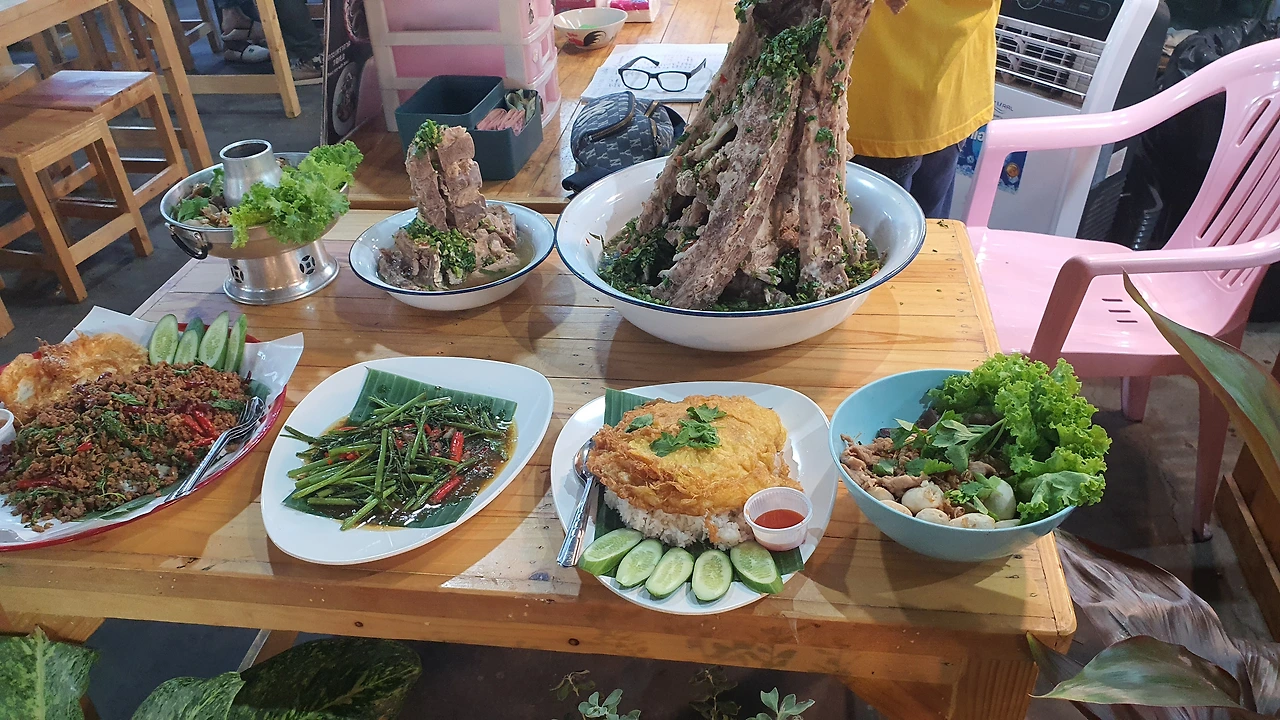 태국에는 소고기가 드물다. 대부분 까만 물소라 육질이 질겨 한우처럼 품질이 뛰어나지 않아 태국에는 닭고기와 돼지고기가 일반적이다. 이곳의 느아삥의 기본 소스는 매운 마라향과 데리야끼 간장 소스 2가지. 역시 고기에 지방이 많고 육질 자체가 질기다.