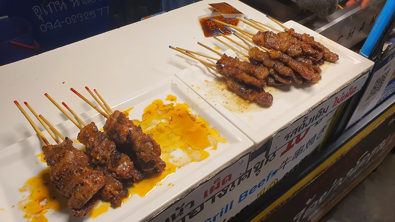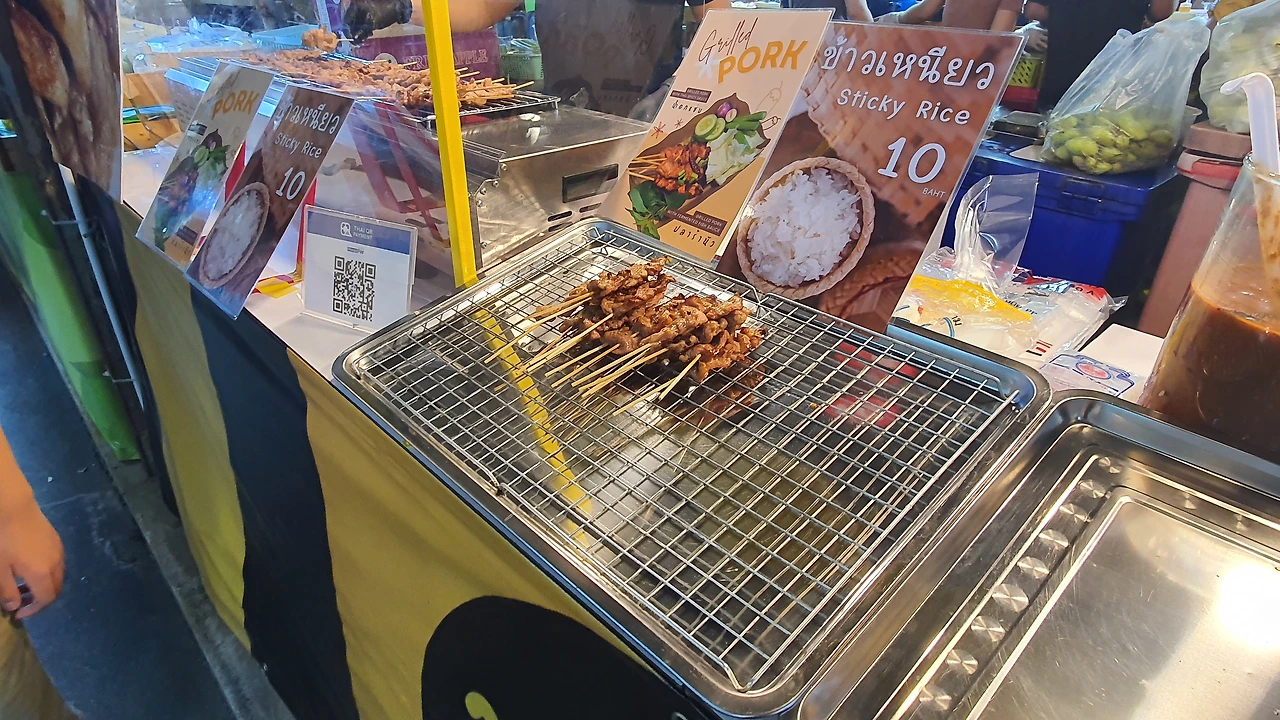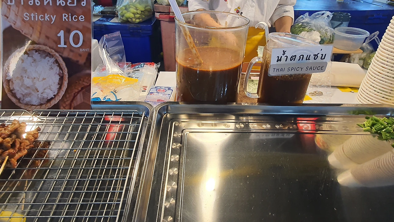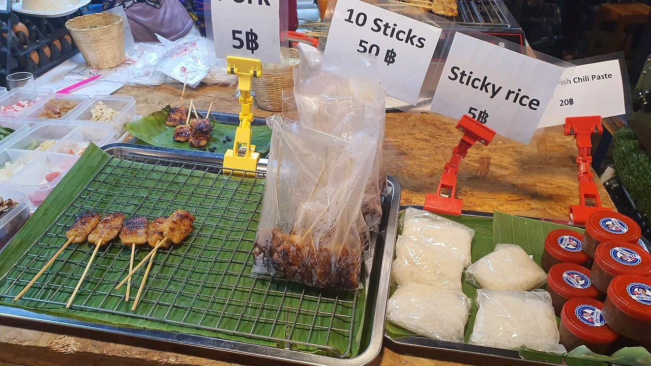 꼬치를 파는 가게는 약 4곳으로 고기 종류에 따라 치킨(까이), 돼지고기(무), 소고기(느아) 꼬치를 팔고 있었다. 사실 꼬치라는 게 웬만해서는 실패할 수 없는 메뉴이다. 보통 꼬치는 찰쌀 밥과 같이 파는데 태국 사람들은 꼬치 1세트(5개)를 찹쌀밥과 함께 패스트푸드처럼 먹는다.