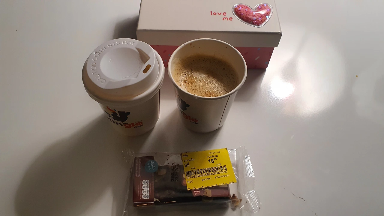 핫 라테를 한잔 주문하고 빵 코너를 둘러보던 중 브라우니가 할인 판매하고 있었다. 무려 25밧(1,000원)에서 18밧(약 700원) 이런 건 무조건 사줘야 하는 것. 집에 과일도 떨어져 사과도 고르다 보니 주문한 커피가 나와있다. 그런데 1잔이 아닌 2잔이다. 아차 싶다. 커피 뽑을 때 한눈을 판 것이다.