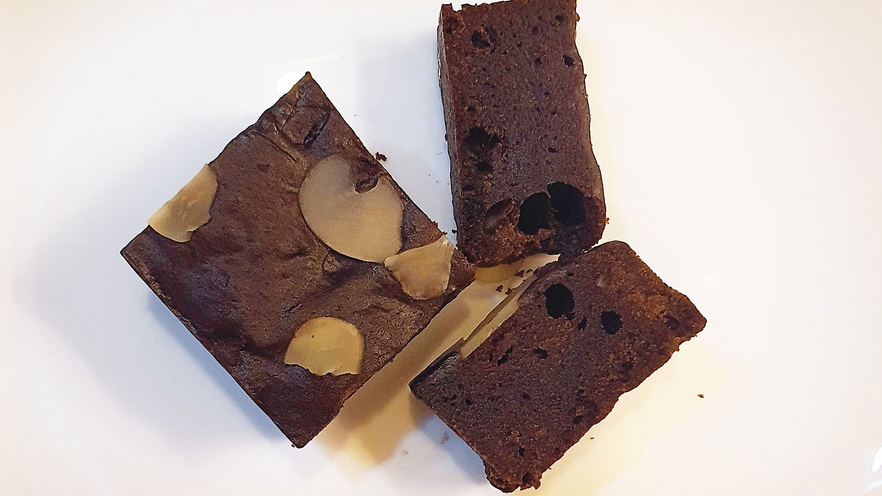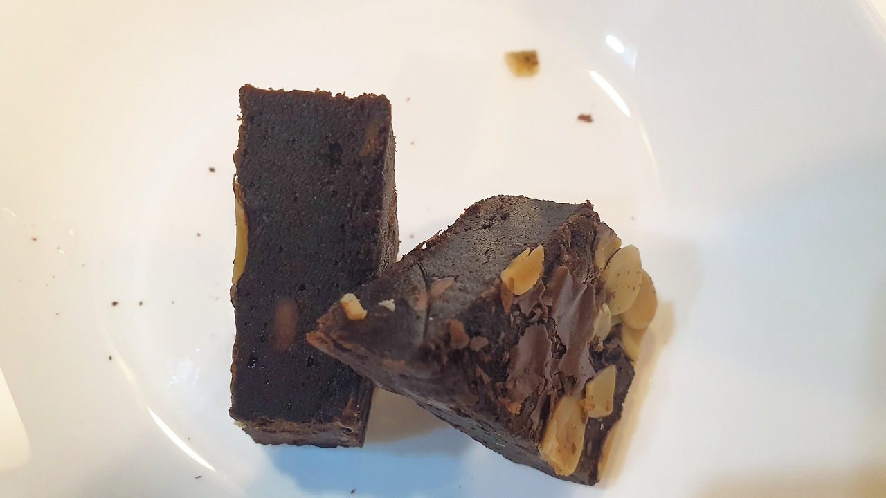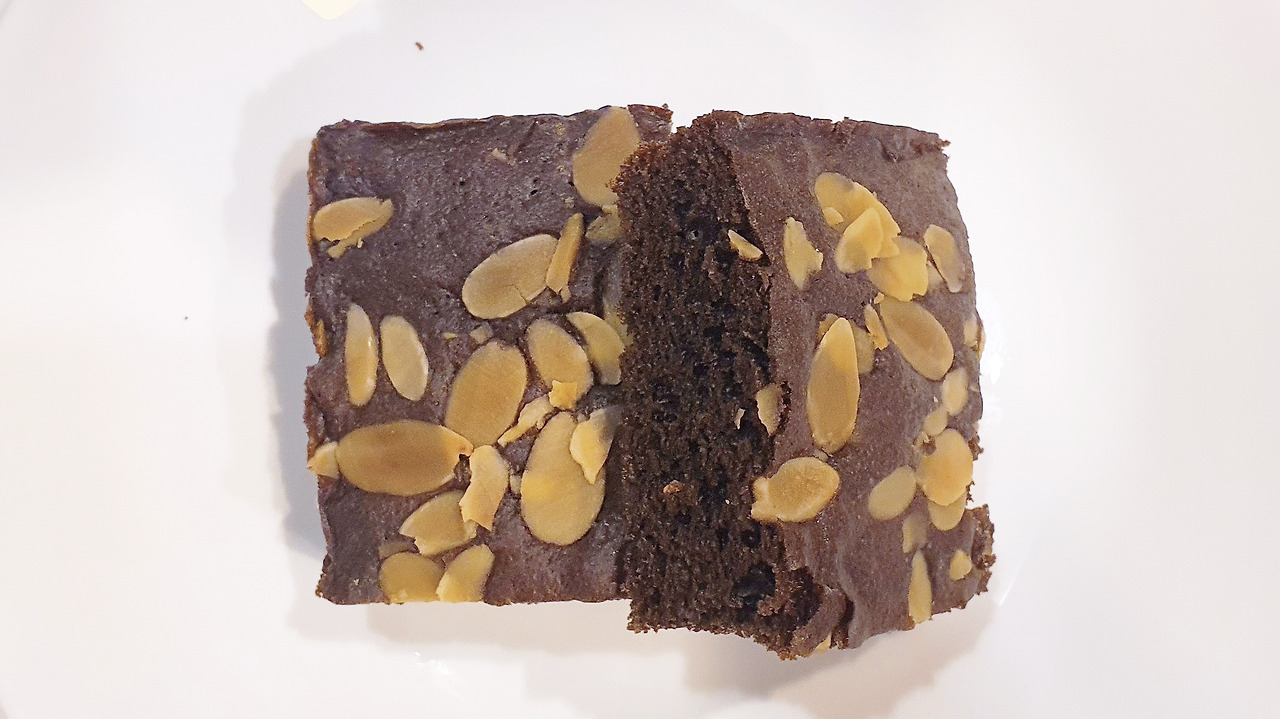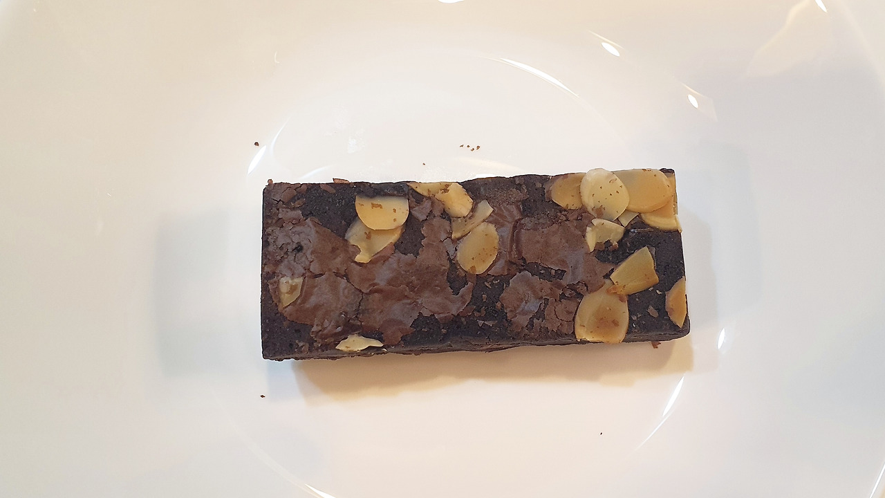 ▶ 맛 : 다크 초콜릿 브라우니는 브라우니 케이크보다 밀도가 높아 묵직하고, 초코퍼지 브라우니보다는 부드럽다. 토핑으로 슬라이스 넛이 뿌려져 있어 고소함을 더한다. 다크 초콜릿의 특유의 쌉싸름한 맛이 인상적이며 달지 않아 단것을 좋아하지 않는 사람에게 적합하다.