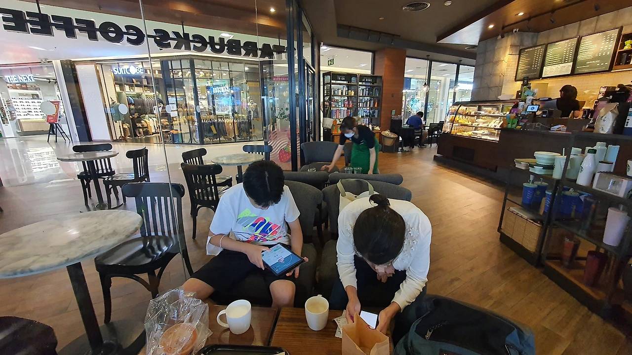 서로의 관심사가 다르니 먹고 싶은 것도 다르다. 그래서 저녁식사는 뭐든 잘 먹는 나와 큰아이, 입맛이 까다로운 아내와 작은아이 2팀으로 나눠 따로 먹기로 하고, 1시간 뒤 정해둔 카페에서 만나기로 했다. 나와 큰아이는 서로 원하는 음식을 선택할 수 있는 푸드코트로 아내와 작은아이는 편하게식사를 즐길 수 있는 식당으로 이동해 목적에 맞는 식사를 했다.