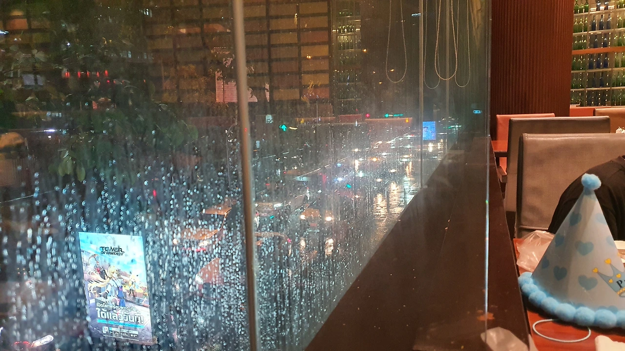 다행히 오후 5시까지 비가 내리지 않자 택시를 불러 예약된 뷔페로 향한다. 예상처럼 퇴근 시간과 겹쳐 목적지 근처에서 차가 움직이지 못한다. 그때 택시 유리창에 한 방울씩 물방울이 떨어진다. 예약시간보다 30분이 늦은 터라 비가 더 오기 전에 택시에서 내려 서둘러 이동했다. 무사히 뷔페에 도착하니 그제야 어두운 하늘 주위로 번쩍번쩍 플래시가 터지며 천둥 같은 박수소리로 축하해 준다.