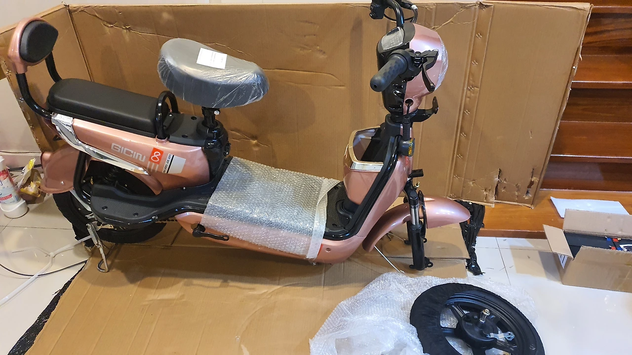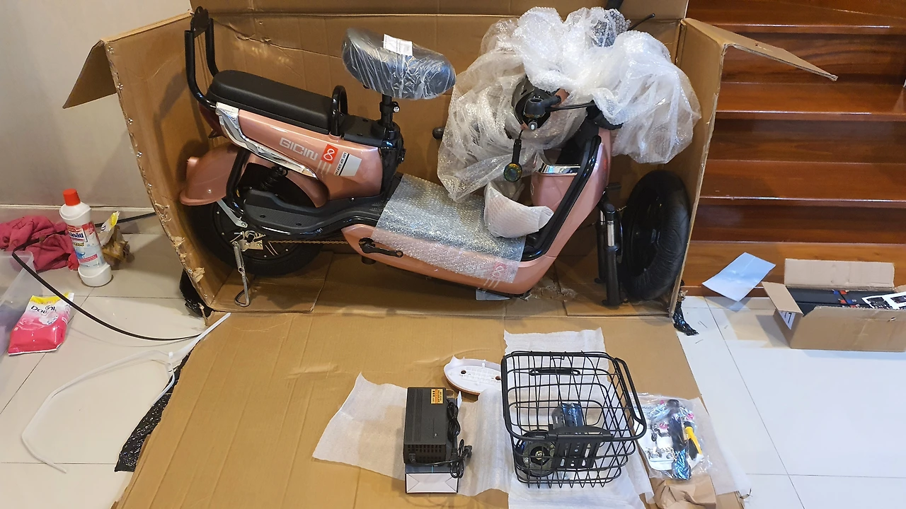 사실 자전거가 28만 원이면 싸다고 볼 수 없다. 그렇다고 품질 또한 기대할 수 없다. 거대한 박스를 뜯어보니 '과연 잘 달릴 수는 있을까?' 란 걱정이 든다.최소한 바퀴는 다 달려 있을 줄 알았는데 바퀴도 핸들도 페달도 배터리도 대부분의 부품이 분해된 상태. 거대한 박스에 담긴 전기자전거는 반조립 상태로 구매자가 조립을 해야 했다.