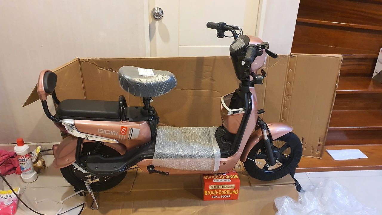 몇 주 동안 고민하면서 결국 선택한 전기자전거. 유지관리도 편하고 저렴한 가격으로 동네에서 타고 다니기에 더할 나위 없어 보인다.인터넷 쇼핑몰에서 구형 제품이 50% 이상 할인된 가격 7,000밧(28만 원)으로 나와 있기에 바로 주문하였다. 배송날짜 보다 하루 늦게 왔지만 나름 온전하게 제품을 받아 보았다.