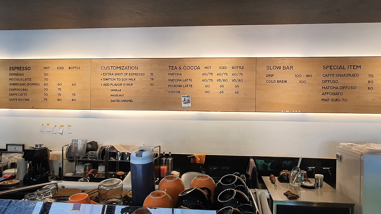 대표 음료로는 아메리카노, 라테, 모카 등을 기본으로, 슬로우 바에서는 드립 커피도 판매한다. 논커피 음료로는 대중적인 마차라테, 코코아를, 스페셜 메뉴로 아포가토와 샤케라토의 음료 메뉴로 구성되어 있다. 기본 아메리카노만 마셔도 커피빈을 선택할 수 있으니 고민 없이 아메리카노로 선택했다.