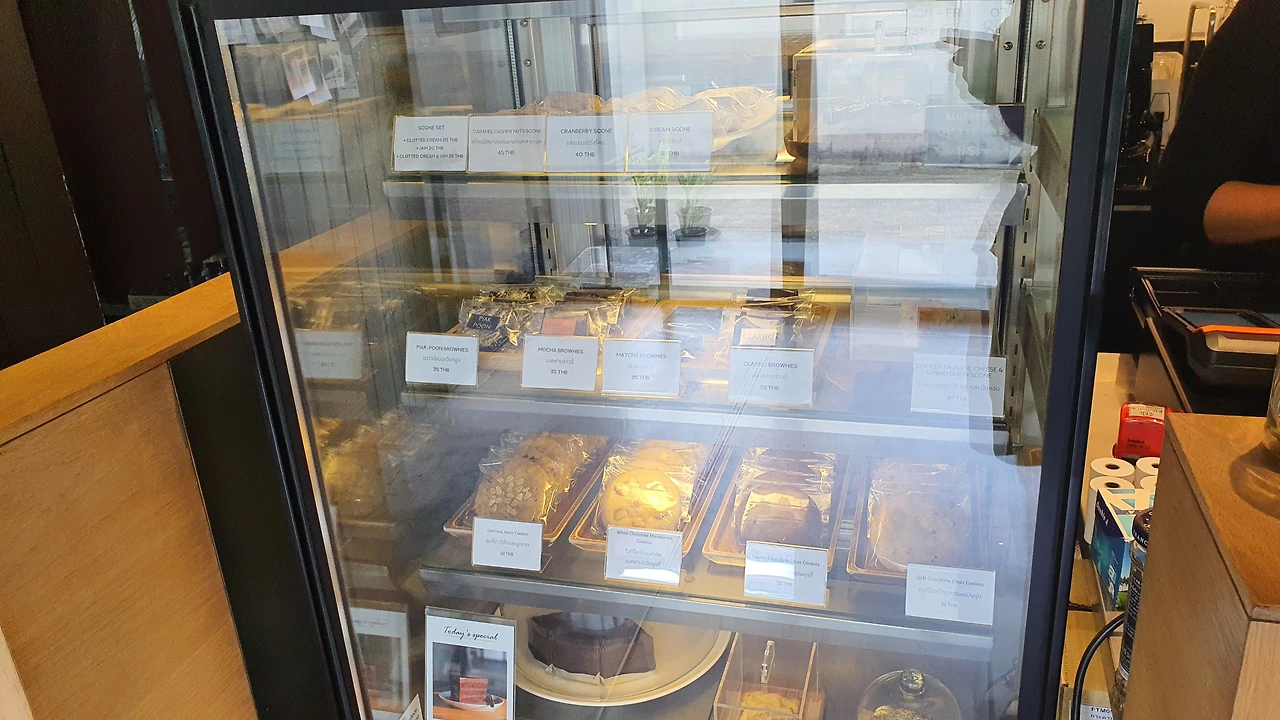 카페 주변에 저렴한 식당이 많기 때문인지 케이크 외 음식 메뉴는 제공하지 않는다. 베이커리 메뉴는 스콘 5종, 브라우니 4종, 쿠키 5종 등 단순하지만 기본에 충실하다. 오랜만에 스콘을 먹어볼까 고민하다 clotted 크림과 딸기잼을 별도로 구매해야 하니 가격이 70~80밧(3,000원)으로 커피값보다 더 비싸지는 단점이 있다.역시 아메리카노엔 브라우니다.