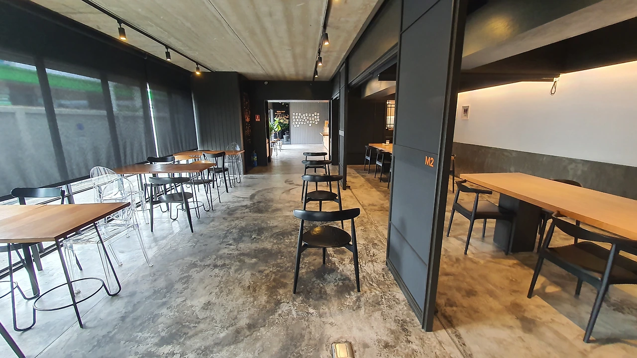 50평 되어 보이는 내부 공간에 6인용 대형 미팅 테이블 2개와 4인용 테이블 5개, 창가를 향해 있는 긴 바 테이블 등으로 구성해놓아 공간이 여유롭다. 개인적으로 긴 미팅 테이블을 좋아하는데 오늘은 주말 아침이라 직장인들이 없어 이른 아침 대학 중도의 대형 책상을 혼자 쓰는 호사를 누리는 기분이다.