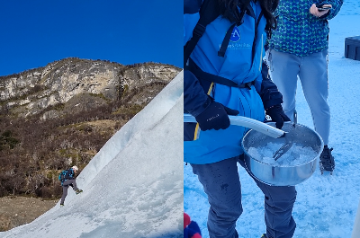 먼저 가이드가 직접 빙하를 올라서 얼음을 캤다.