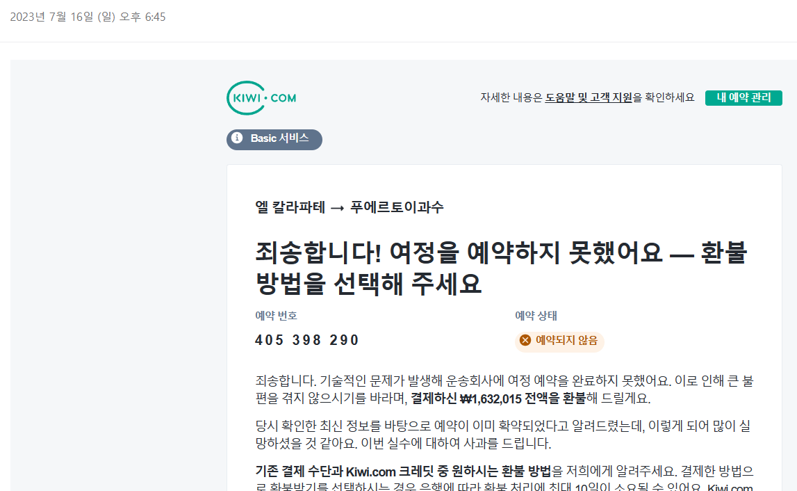 Kiwi 사이트 100% 잘못이니 환불을 해주겠다고?