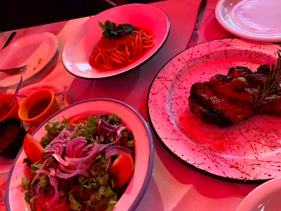 스테이크, 파스타, 샐러드, 와인을 시켰다.