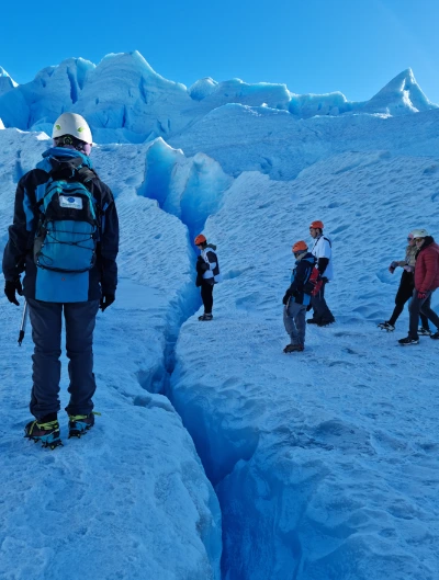 아이젠+헬멧! 안전장비를 착용하고 제대로 빙하 위를 걷기 시작했다.
