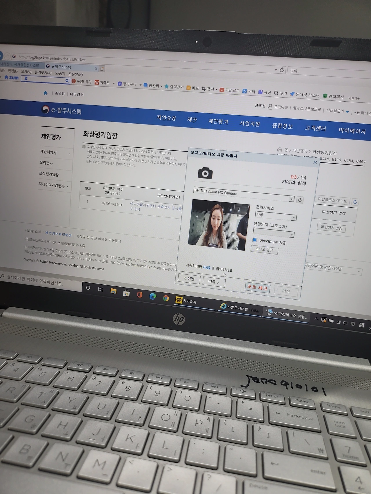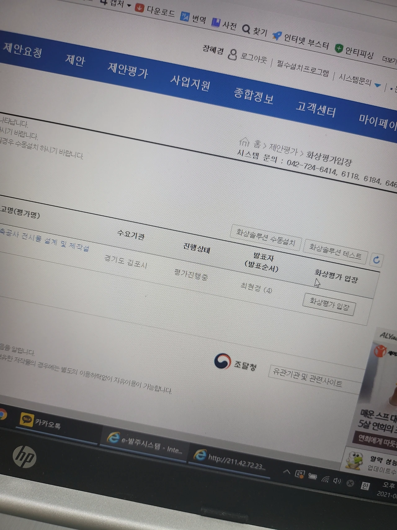 조달청 평가를 할때는 나의 발표순서에 맞추어 나라장터에 업체 명의로 로그인한후