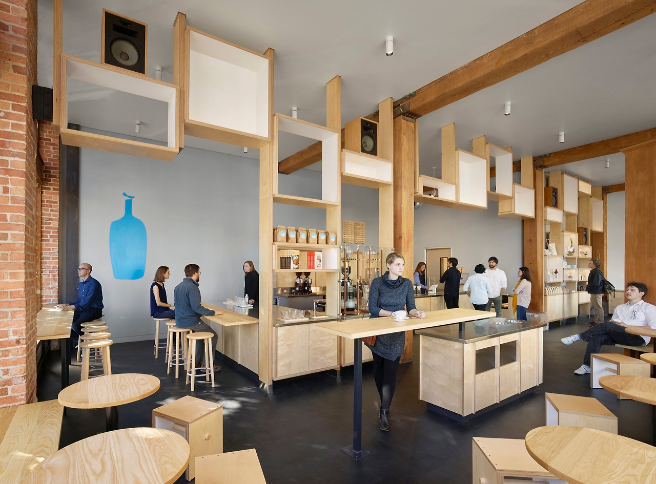 블루보틀은 바리스타, 고객, 커피만을 위한 무대 공간으로 정의한다. 고객에게 시각적인 방해가 될 만한 요소를 제거하는 것이 블루보틀의 공간 원칙이다. 고객의 커피를 내리는 바리스타의 커피 추출 장면을 방해 요소 없이 오감으로 즐기며 감상할 수 있는 시간을 제공하는 것에 초점을 맞추었다. 고객이 경험하게 될 일관된 커피의 제조 과정과 그 시간을 여과 없이 즐기도록 말이다.