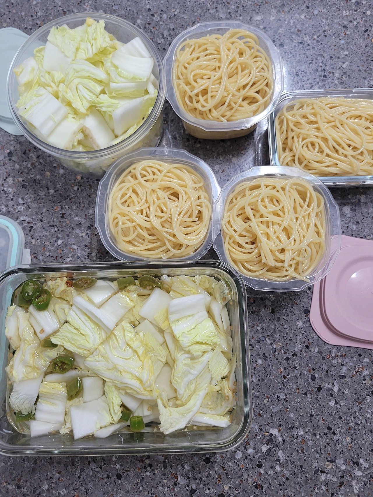 주말에 주중 저녁 먹을 음식을 만들어두는 것에 재미 들렸다. 배추로 동치미(유튜브에 검색하면 식초물 끓이지 않는 방식도 나옴), 파스타면 삶아서 올리브유 뿌린 후 냉동해 두었다. 이렇게 만들어도 밖에서 저녁 먹는 일 많지만, 귀찮을 때 조금이라도 집밥을 고려해 봄직한 장치가 생긴 기분이다.