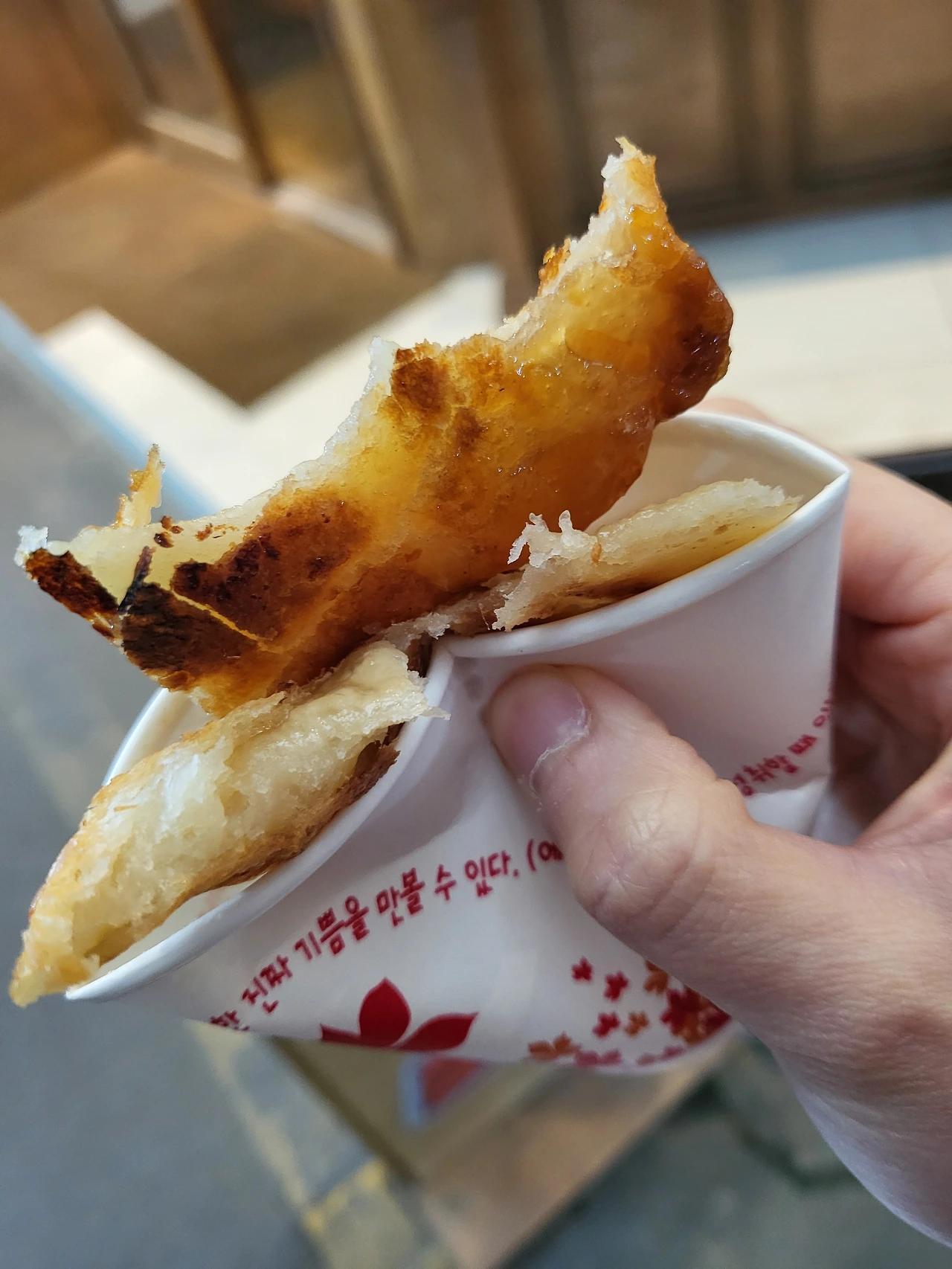청주를 간 건 아니고, 쫄쫄이호떡 분점이 대전에 있다는 걸 우연히 알게 돼 맛보았다. 호떡을 집에서 만들어보고 싶을 정도로 꽤나 호떡에 진심인데, 여기 호떡 정말 맛있다! 분명 속에 시럽이 안 든 것처럼 보이고 흘러나오는 게 없는데 맛보면 고루고루 잘 배어 있다. 비법이 뭘까, 유튜브에 '쫄쫄이호떡 만들기' 영상을 봤으나 여전히 그 원리를 이해할 수 없다.