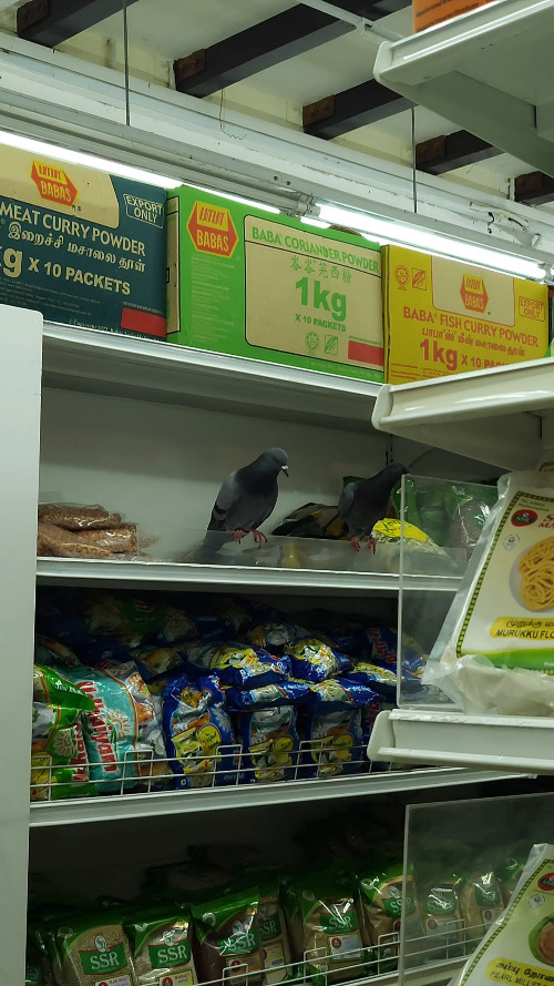 들어서자마자 상품 진열대 위에 앉아 있는 비둘기 몇 마리가 눈에 들어왔다.