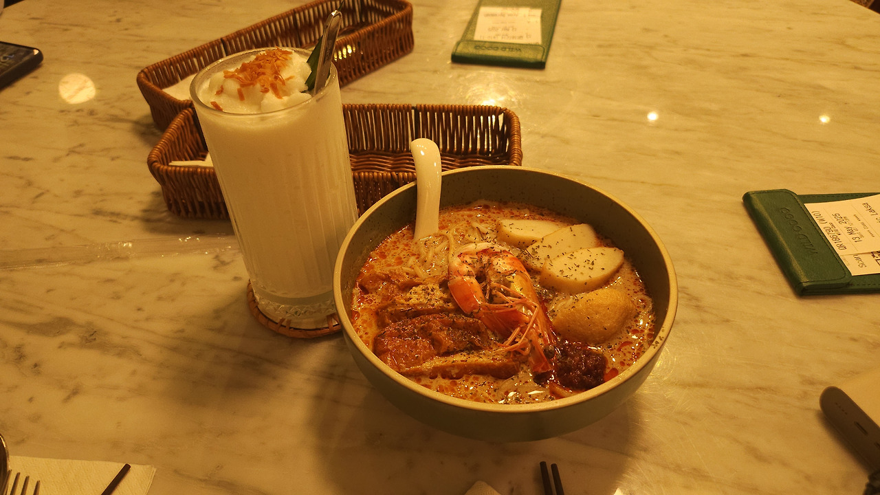 뜨거운 국물이 담긴 락사가 나오자 향신료 특유의 향이 먼저 훅 들어왔다.