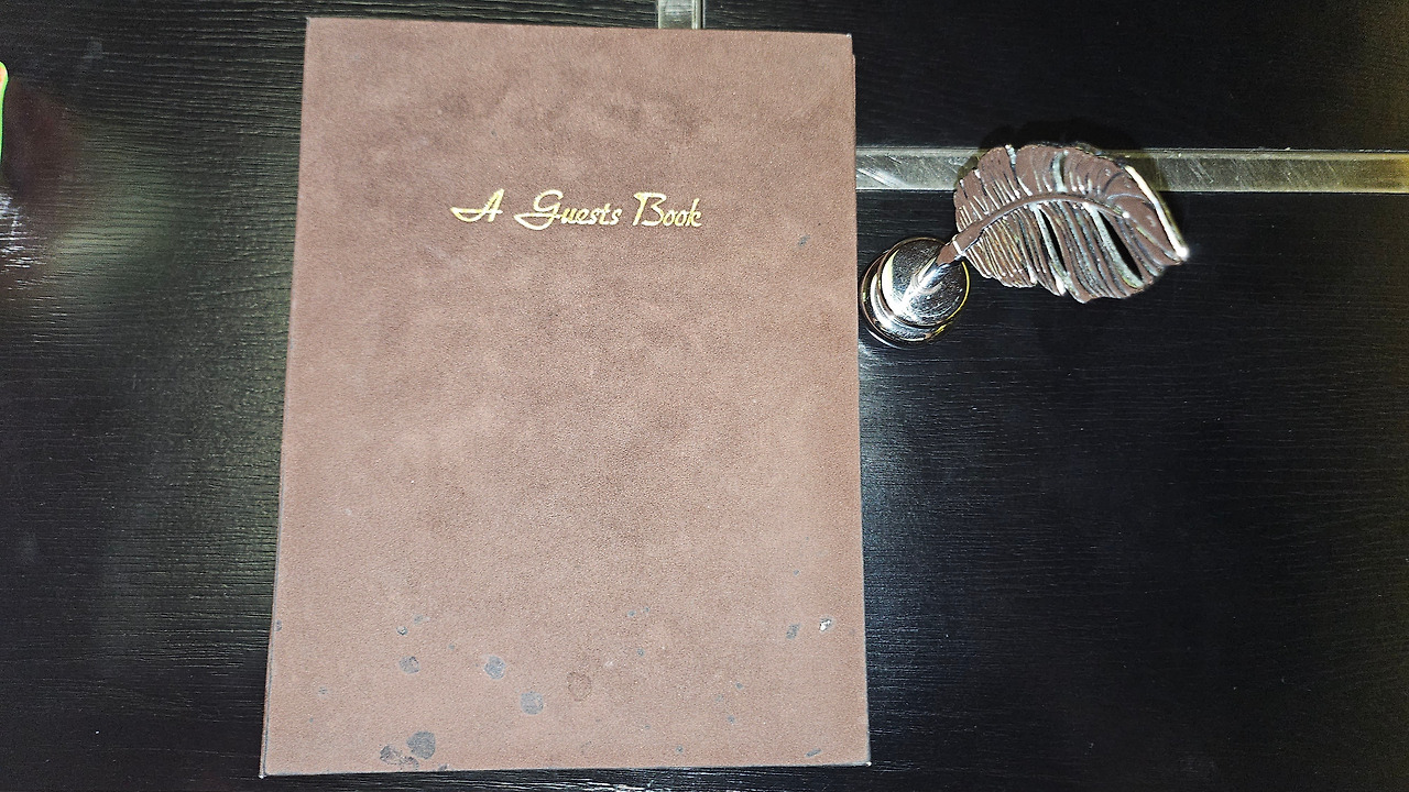 부드러운 갈색 스웨이드 노트 표지에는 'A GUEST BOOK'이라는 글자가 적혀 있었다.