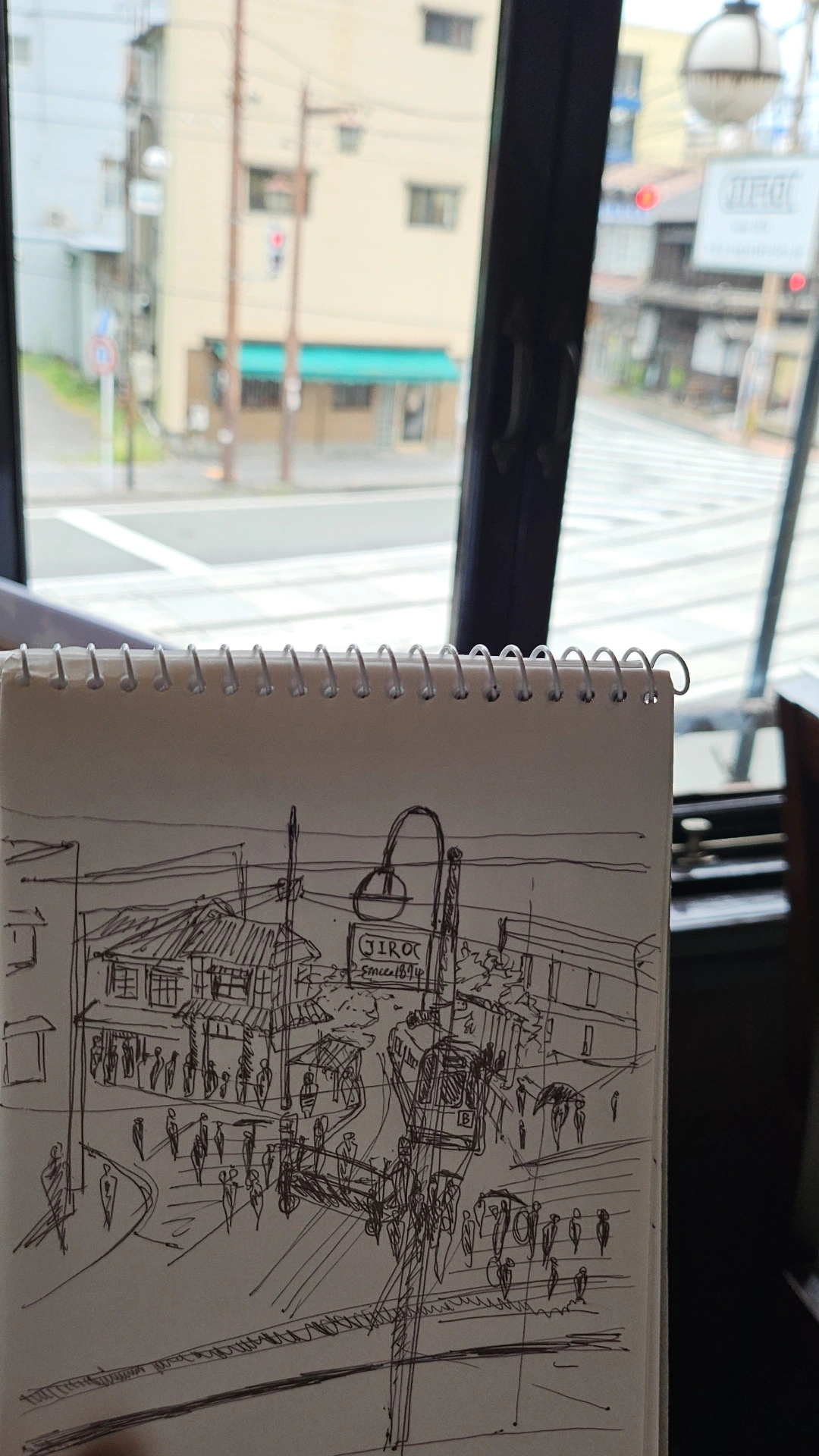 창밖 풍경을 볼펜으로 휘갈겨 그린 그림에는 흐릿하지만 생생한 풍경이 담겨 있었다.