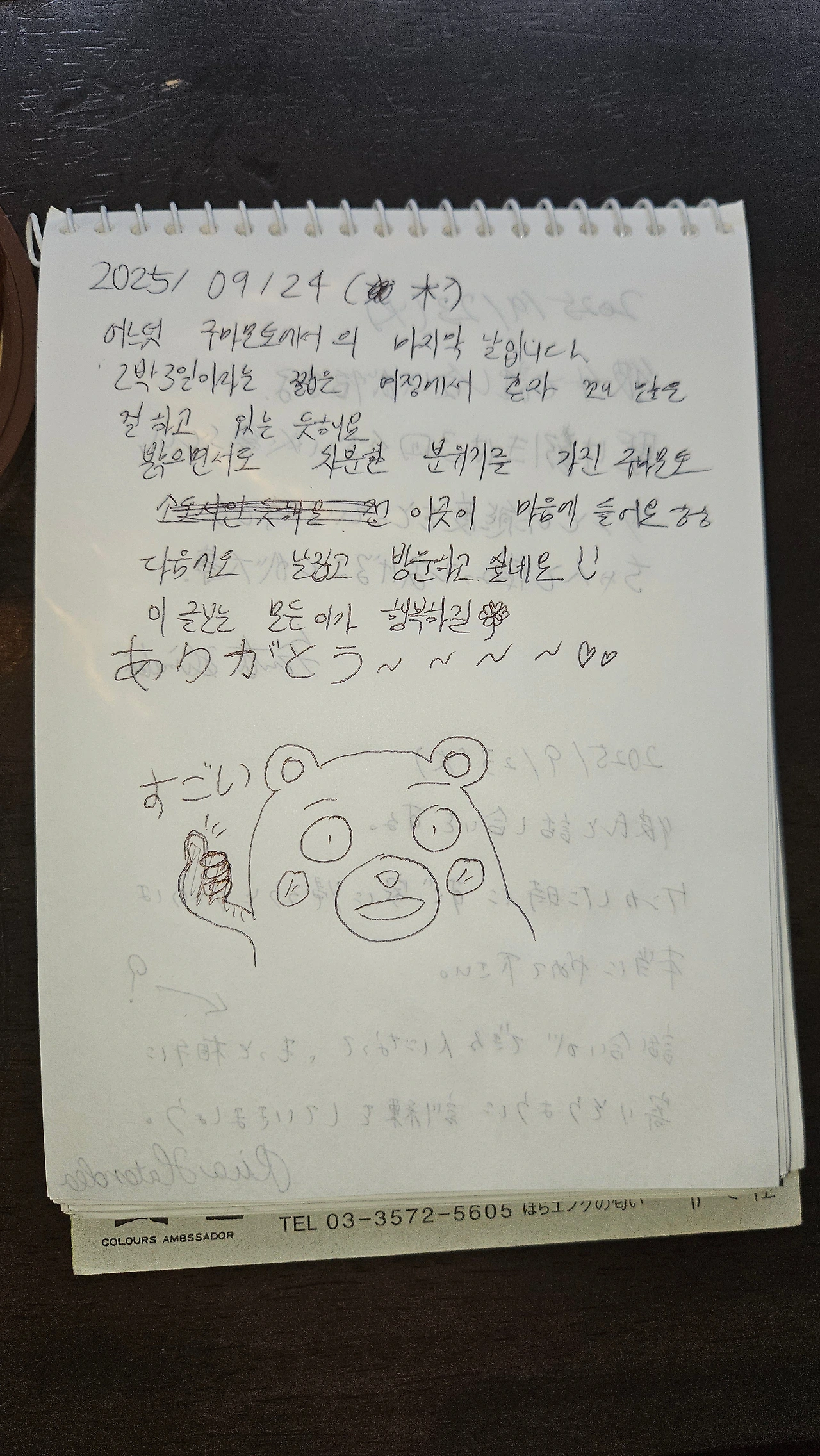 마지막에는 일본어로 'ありがとう(감사합니다)'라고 적고, 쿠마몬도 그려 넣었다.