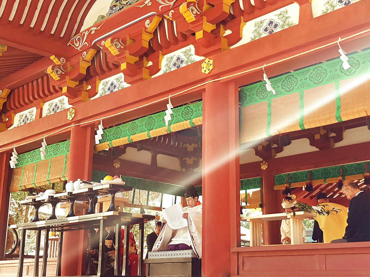 (사진) 신사 경내를 향하는 제단에서 치러지는 일본 전통 혼례식은 제사장의 주도하에 진행되며, 보통 가까운 가족들만이 참여하여 경건하게 진행된다. 이따금 신녀들이 춤을 추며 전통악기들이 함께 연주되는 모습을 볼 수 있다.