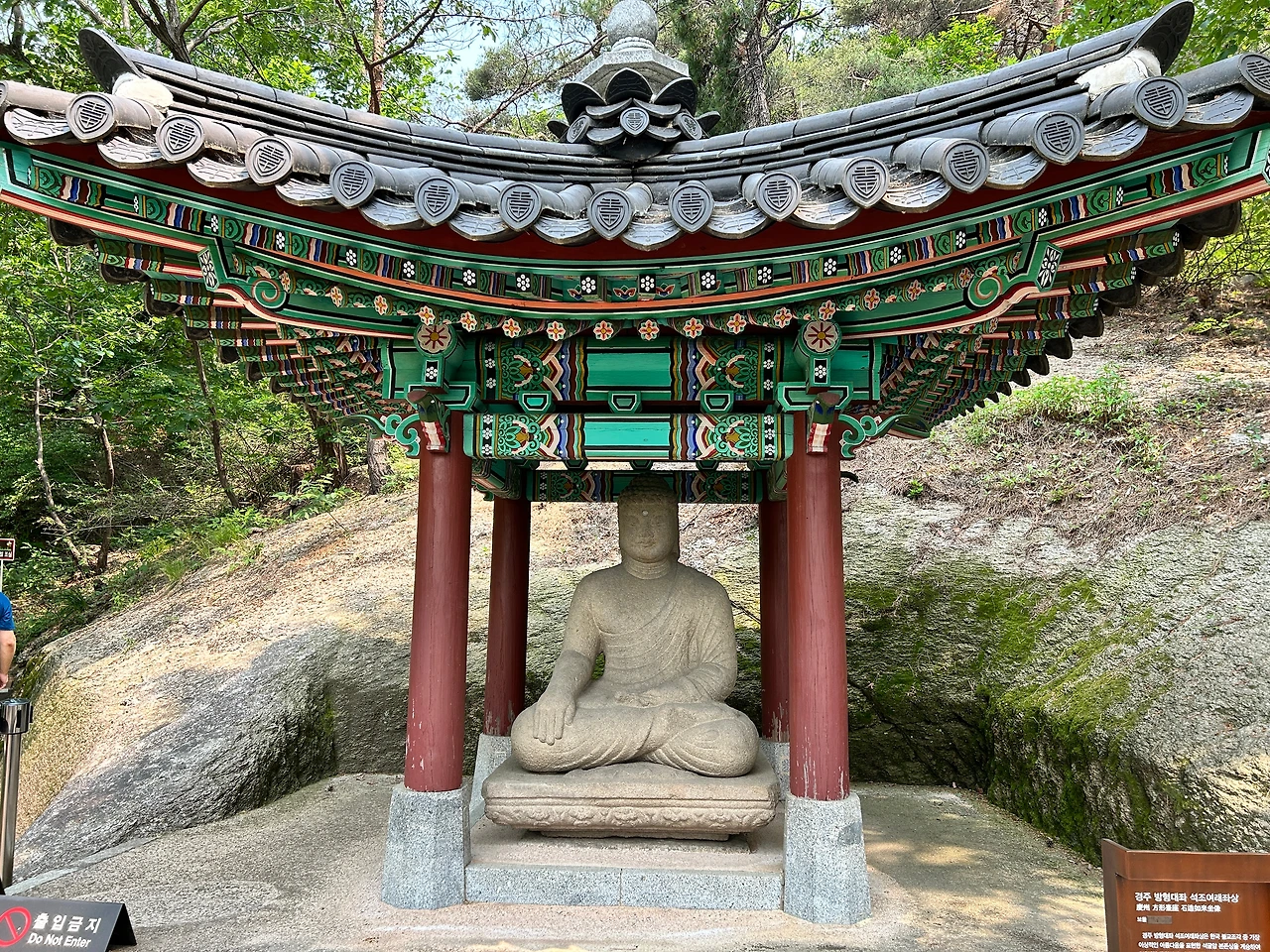 약간 숨이 찰 정도가 되자 내리막이 드러났다. 조금 더 밑으로 내려가니 전각에 앉아 있는 부처를 만날 수 있었다. 불상의 명칭은 ‘경주 방형대좌 석조여래좌상’. 평화롭고 표정과 여유로운 풍채와 달리 이 부처는 지치고 고달픈 여정을 겪어왔다.