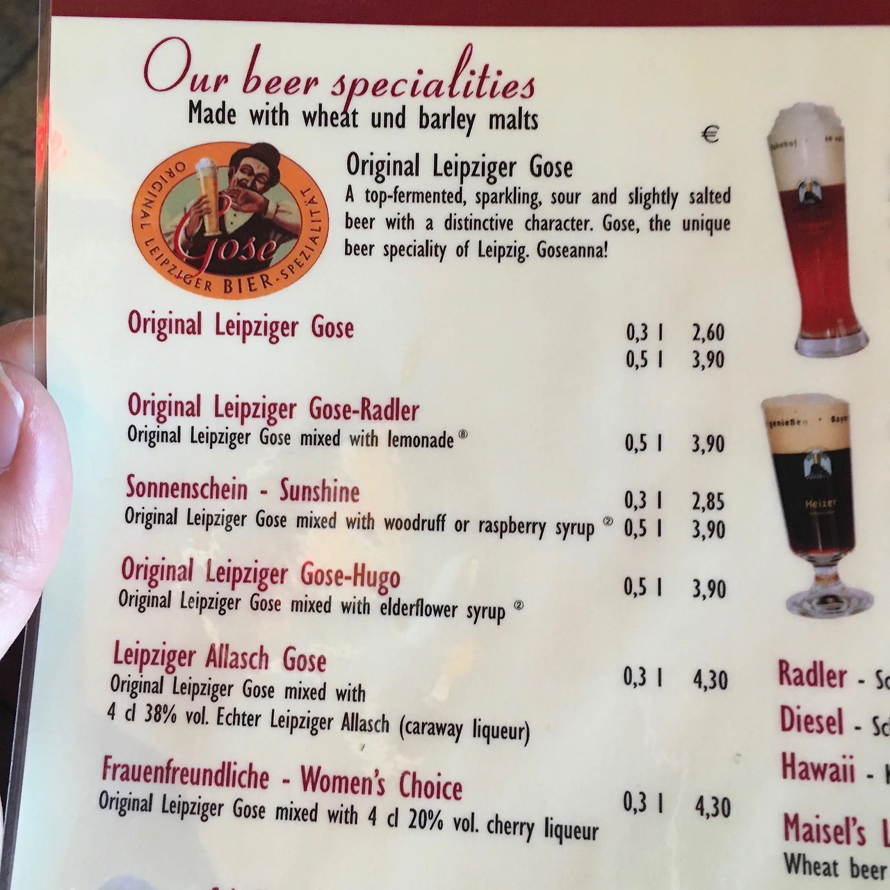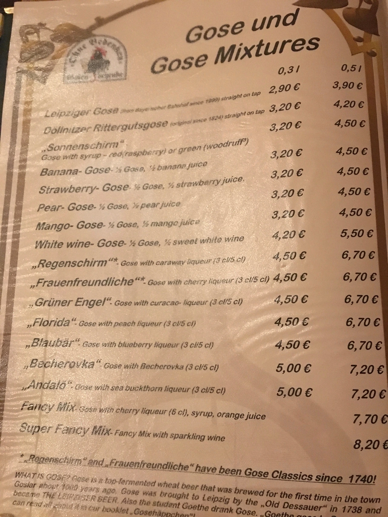 바이어리셔 반호프 고제 브로이 내부는 여느 독일 가스트 호프와 조금 달랐다. 아치 형상이 여기저기 눈에 들어왔고 긴 바와 작은 테이블 그리고 많은 인원이 함께 할 수 있는 룸도 있었다. 밖에는 넓은 비어가든도 보였다. 그러나 무엇보다 눈에 띄는 건 구릿빛 장비들이었다. 아름답게 빛을 반사하고 있는 양조 장비들은 이 곳이 고제 맥주 양조장이라는 무언의 시위를 하고 있는 듯했다. 평상시에 예약을 하고 와야 하는 곳이지만 다행히 사람이 많지 않다. 2인 테이블에 앉아 메뉴를 펼치니 다양한 고제가 보인다. 여러 종류의 고제인 줄 알았는데 자세히 보니 고제를 이용한 다양한 칵테일과 믹스쳐였다.