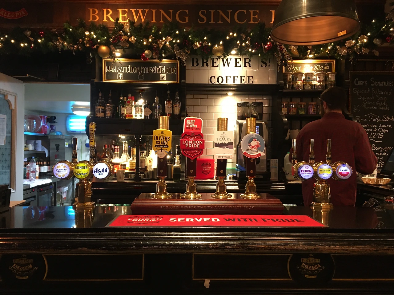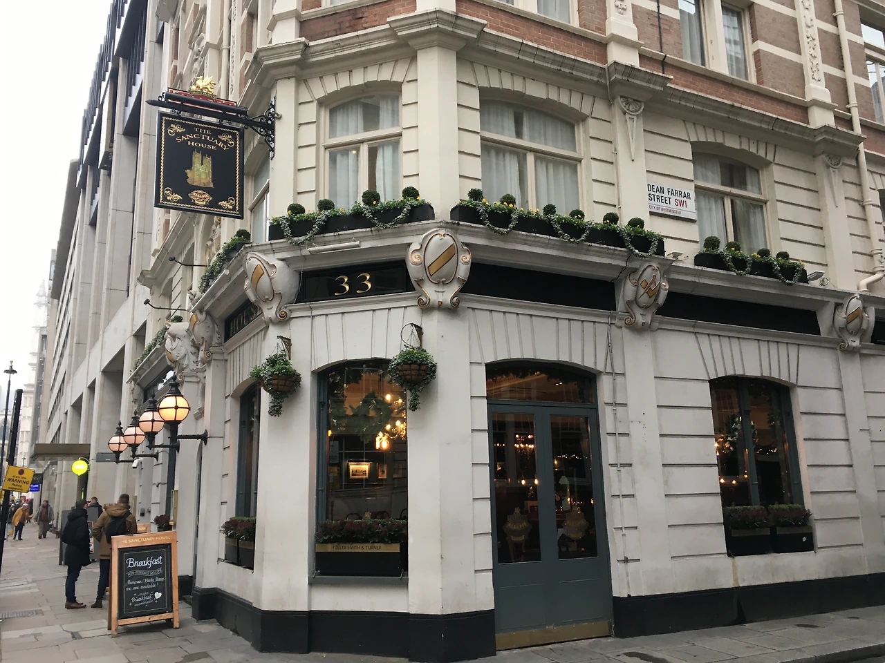 이 건물은 생츄어리 하우스(Sanctuary House)라는 호텔이다. 외부에서 보이는 고전적인 목재 인테리어와 애칭 글래스에서 영국식 감성을 고스란히 느낄 수 있었다. ‘Breakfast Served’라고 쓰여 있는 작은 입간판이 놓인 입구로 들어서자 연말 분위기를 물씬 풍기는 크리스마스 장식들이 우리를 맞이했다. 한쪽으로는 리얼 에일 핸드 펌프와 라거 탭이 구비된 바가 있었고 고풍스런 샹들리에와 영국식 창문은 이국적인 분위기를 만들고 있었다. 아침 10시였지만 큰 테이블은 이미 사람들로 차 있었다. 우리는 한쪽 면이 기둥에 붙어있는 아담한 3인석 테이블에 자리를 잡았다.