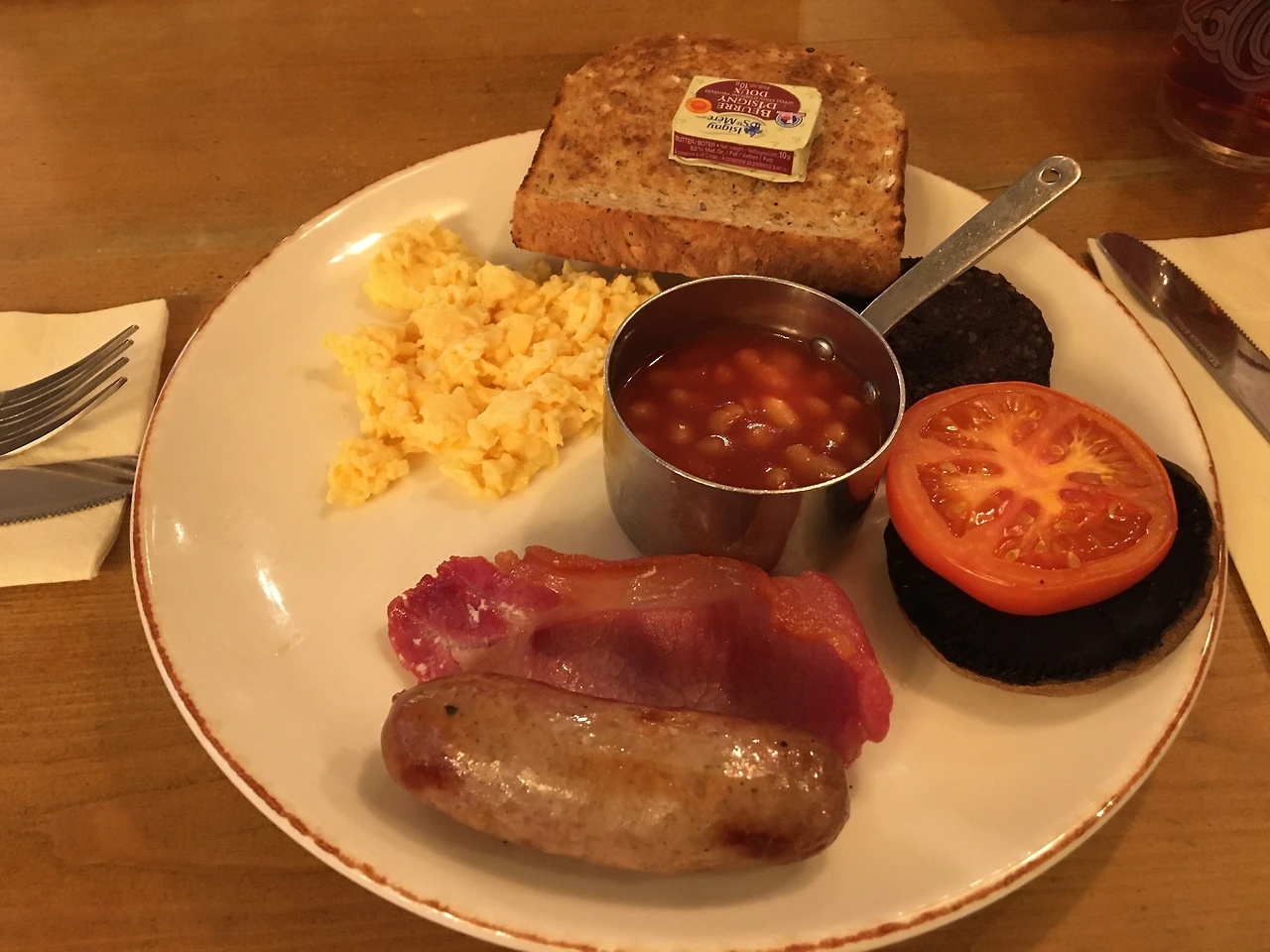 원래 이 곳은 고기를 넣은 영국식 파이가 전문인 곳이지만 우리는 계획대로 ‘잉글리시 블랙퍼스트’를 주문했다. 소시지, 베이컨, 구운 버섯, 달걀 프라이, 베이크드 빈, 토마토와 토스트 반 조각 그리고 블랙 푸딩이 큰 접시에 나오는 이 영국식 아침식사는 가장 흉악한 음식 중 하나다. 싸구려 뷔페 한 접시 같은 구성에 가격은 세금 포함해서 13 파운드, 우리 돈으로 무려 25,000원이었으니, 여러모로 최악의 가성비를 가진 아침 식사임은 누구도 부정할 수 없을 것이다.