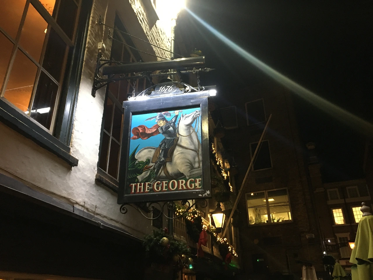 런던 대화재 이후 1677년 재건축된 조지인은 이름부터 범상치 않다. 조지(George)는 4세기 초기 기독교 순교자인 성 조지(Saint George) 또는 성 게오르그를 뜻한다. 용을 퇴치한 전설로 더 유명한 그는 갑옷을 입은 기사의 모습으로 유럽 곳곳에서 볼 수 있다. 조지인의 간판에도 용을 퇴치하는 성 조지의 모습이 그려져 있다.
