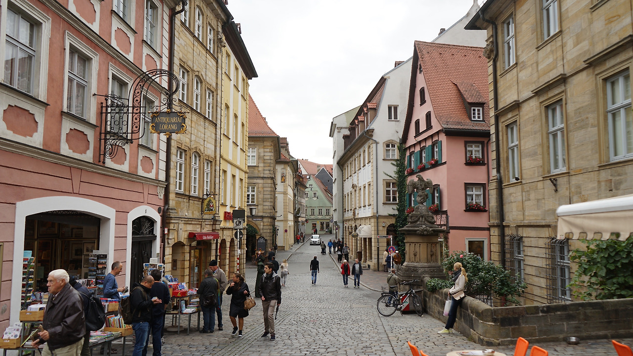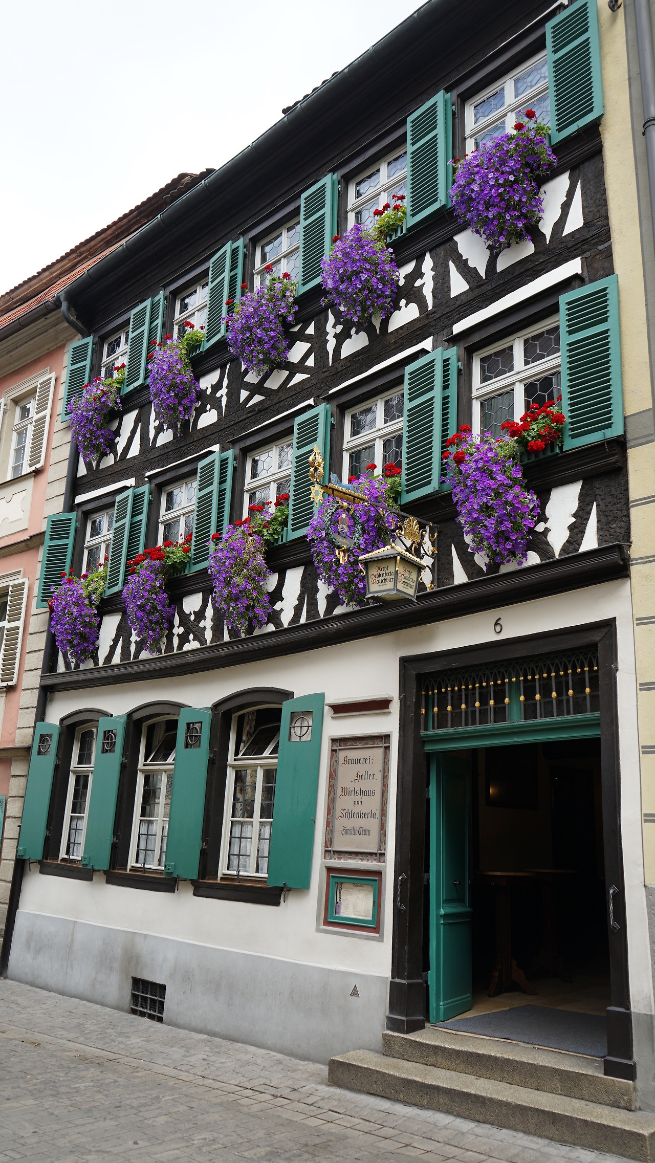 구시가지에 들어서니 마치 중세 시대로 타임워프 한 듯 생경한 풍광이 펼쳐졌다. 마치 붉은색 지붕을 머리에 이은 듯한 독일식 건물들이 좁은 골목을 두고 줄지어 있었다. 흐린 날씨지만 손님을 맞이하기 위해 옹기종기 모여 있는 아담한 테라스는 중세에도 어울릴 것 같았다. 구시청사를 얼마 지나지 않아 보라색 꽃들이 난간에 만발한 건물이 보였다. 아침이었지만 그곳은 이미 사람들로 북적이고 있었다. 오리지널 라우흐비어, 훈연 맥주를 마실 수 있는 슈렝케를라였다.
