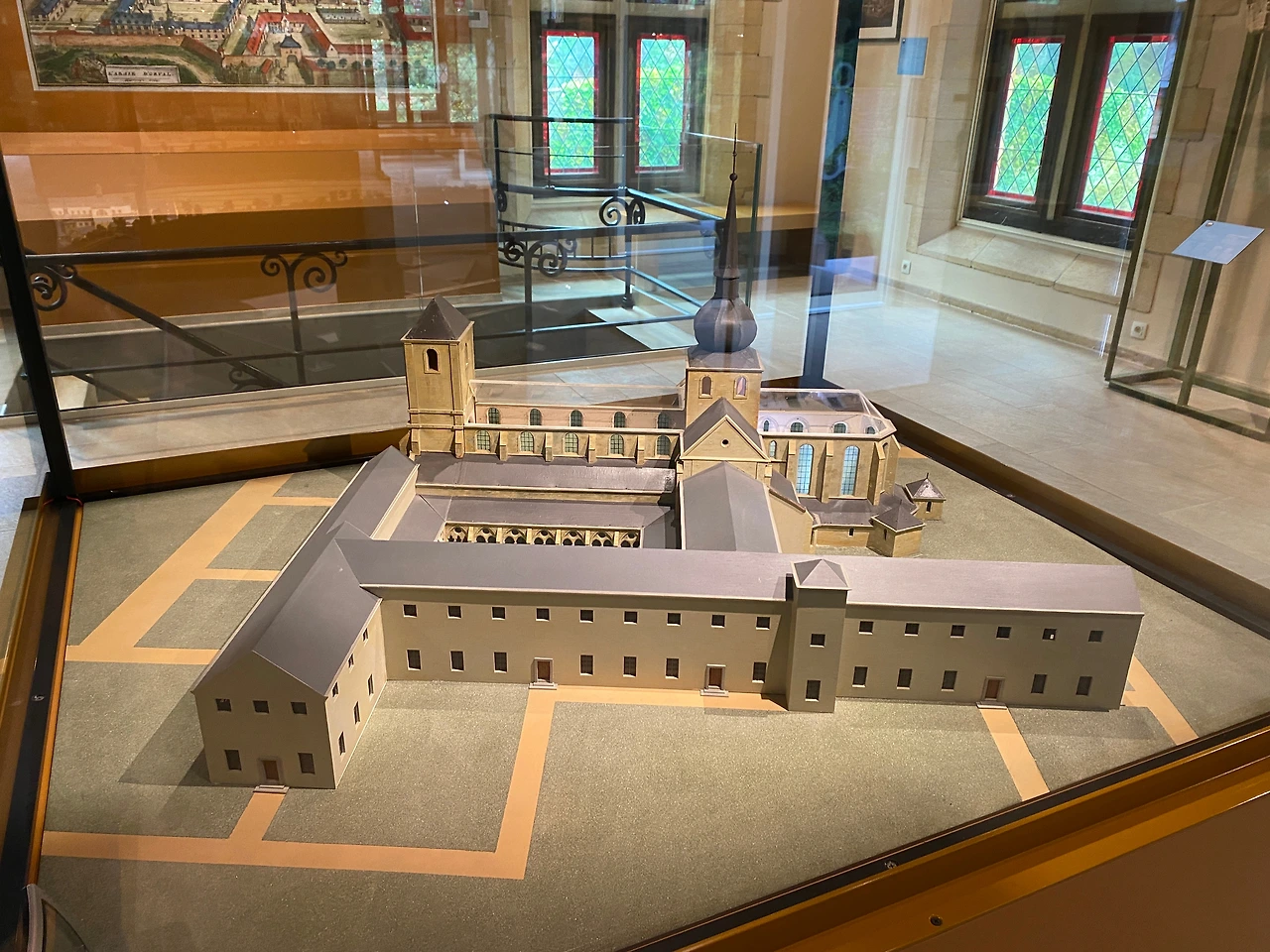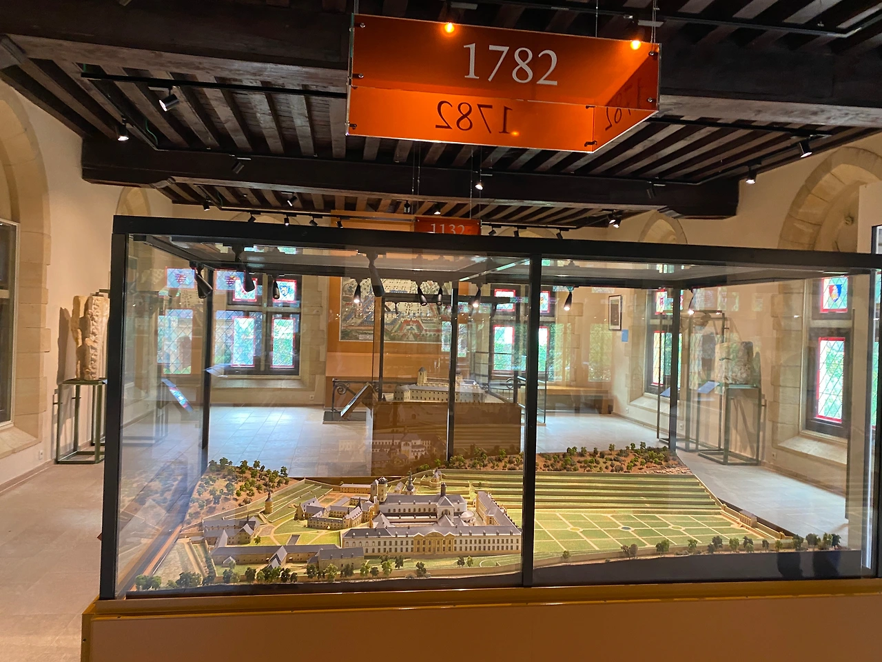 2층으로 올라가니 흥미로운 건물 모형이 눈길을 끌었다. 오르발 수도원의 변천사를 시대 순으로 보여주는 모형이었다. 1132년 초창기부터 1782년 프랑스혁명 직전, 그리고 1948년 완공된 지금의 모습까지 수도원은 형태와 배치, 규모가 모두 달랐다. 유일하게 비슷한 건, 외관의 누리끼리한 색이었다.