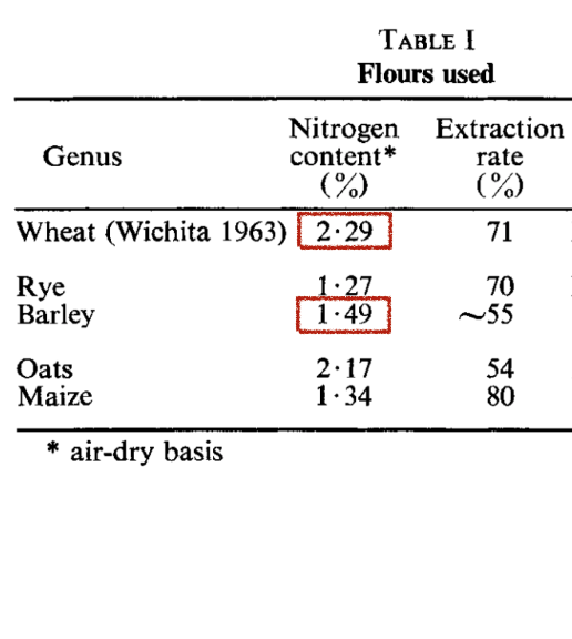 J.A.D. Ewart (1967) "Amino acid analyses of cereal flour proteins." Journal of the Science of Food and Agriculture 18, 548-552