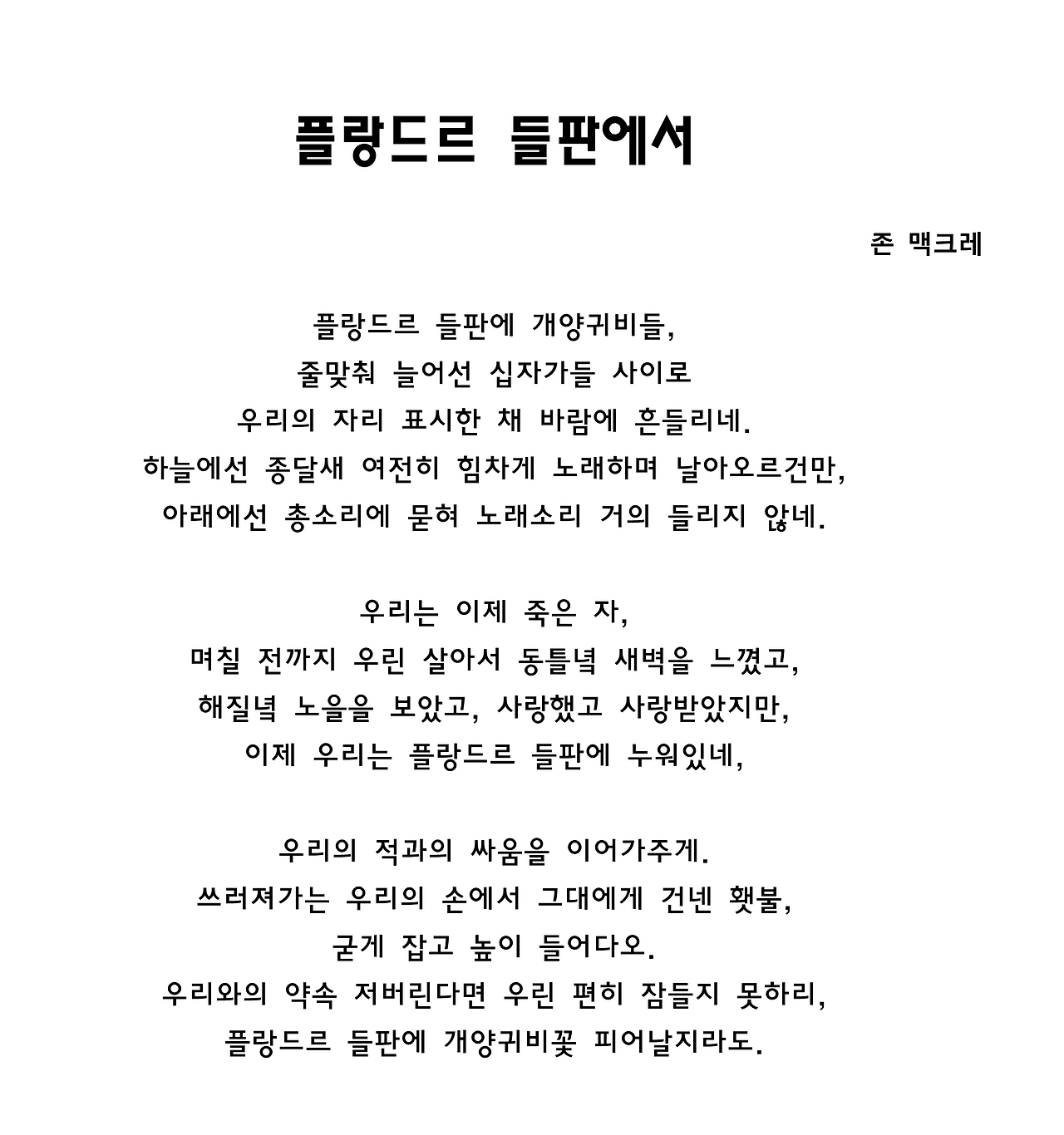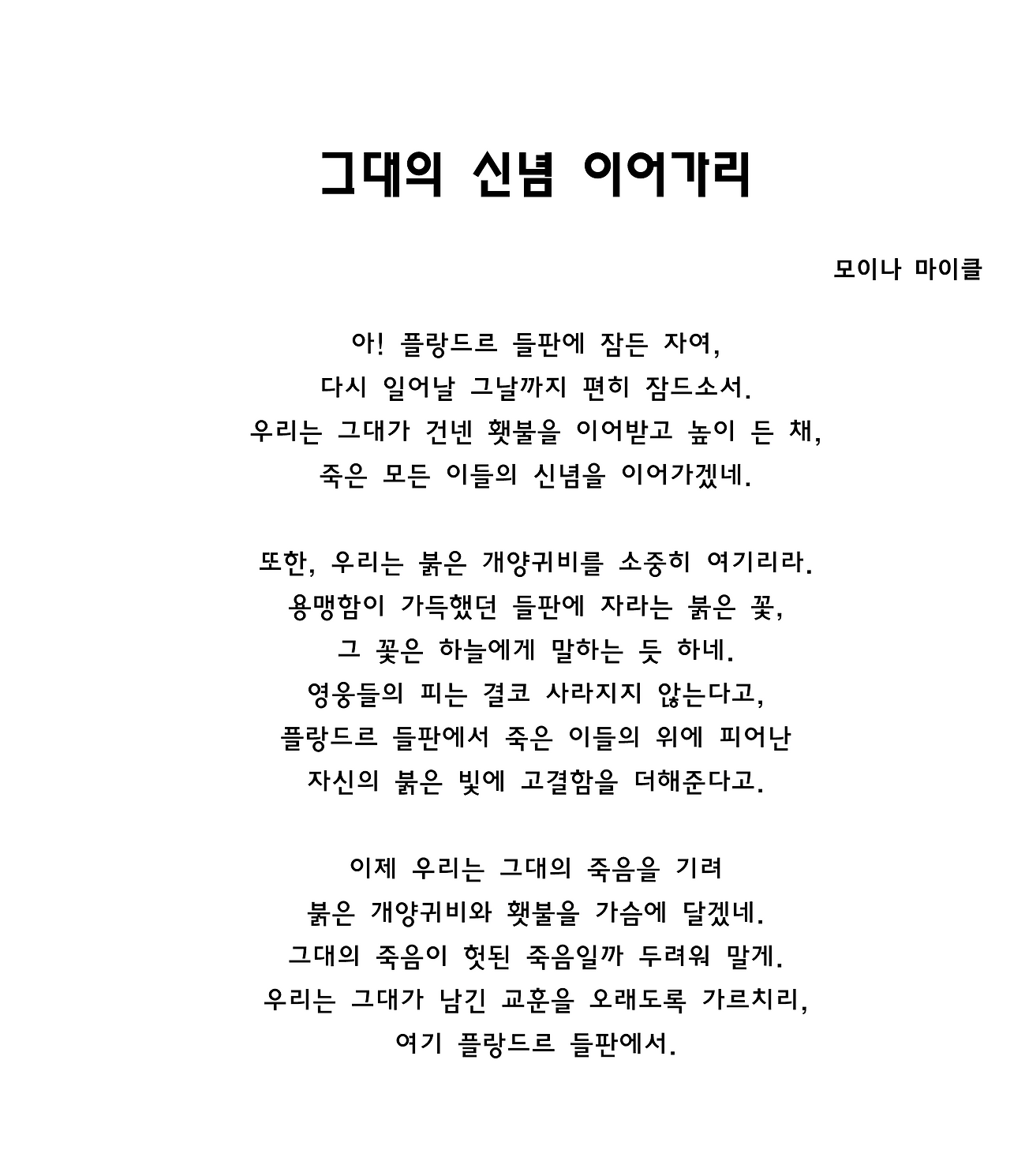 시에서 등장하는 개양귀비꽃은 이러한 전쟁 속 희생을 의미한다. 본래 잡초처럼 어디에서나 잘 자라던 이 꽃은 강한 생명력을 지녀 포격으로 폐허가 된 땅에서도 다시 피날 수 있었다.