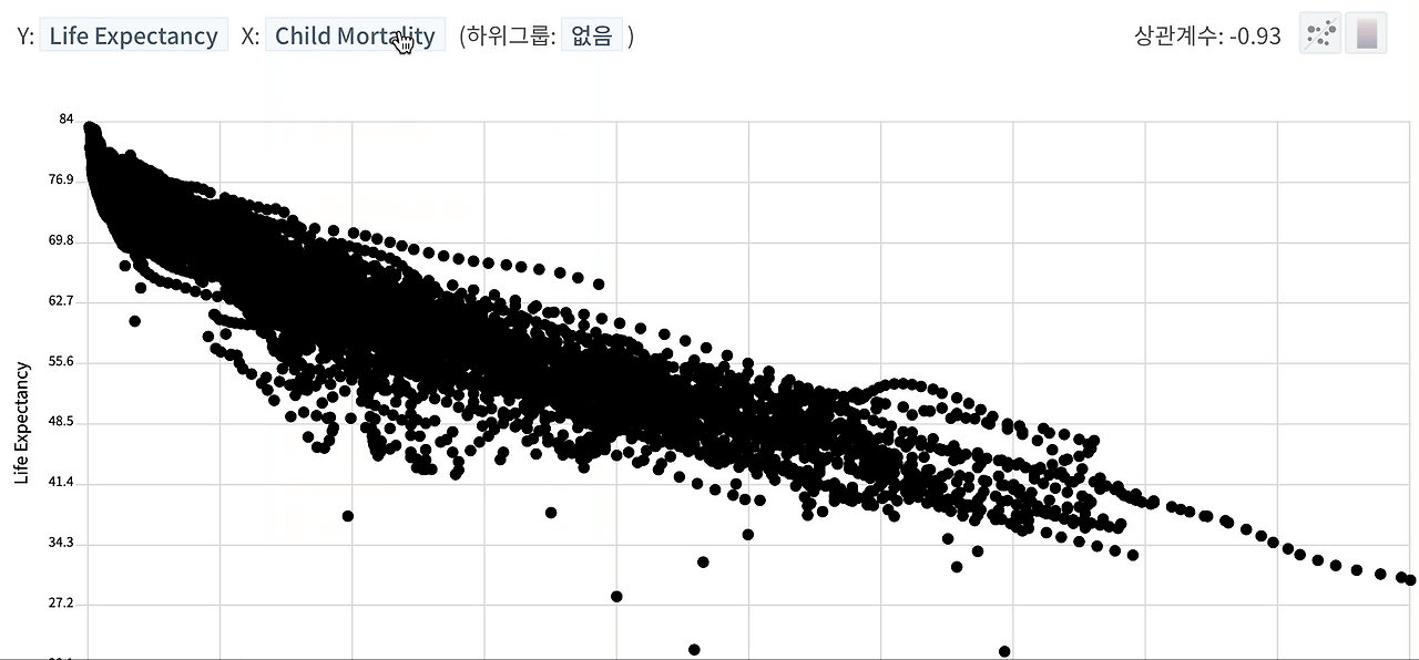 반면에 두 번째 이미지는 하트카운트를 이용해 데이터셋을 시각화한 상태입니다. 기대수명과 수입에는 어떤 관계가 있는지, 시간이 흐르면서 기대수명은 어떻게 변하는지 등을 한 눈에 알 수 있습니다.