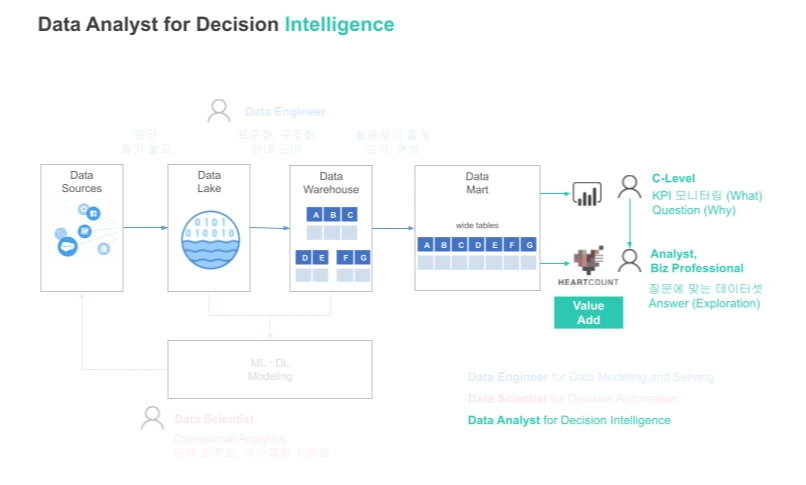 데이터 분석가는 조직의 Decision Intelligence를 돕는 사람들입니다. C-Level에서 주요 지표(KPI)를 보고 받고, 수치의 변화 이유를 물을 때를 위한 Data-Driven 답변, 관련 자료들을 준비하곤 합니다. 일반 현업들이 부탁하는 분석을 수행해주기도 하고, 새로운 프로젝트/제품 기획에 앞서 어떤 데이터를 수집할 것인지 정의하고 데이터 분석/시각화를 도맡아하는 등의 업무를 맡습니다. 데이터에서 인사이트를 발견해야 한다는 점이 데이터 사이언티스트와 유사하다고 볼 수 있습니다. 다만, 데이터 엔지니어/사이언티스트에 비해 더 비즈니스와 직접적으로 닿아 현업의 의사결정을 돕는다는 특징이 있습니다.