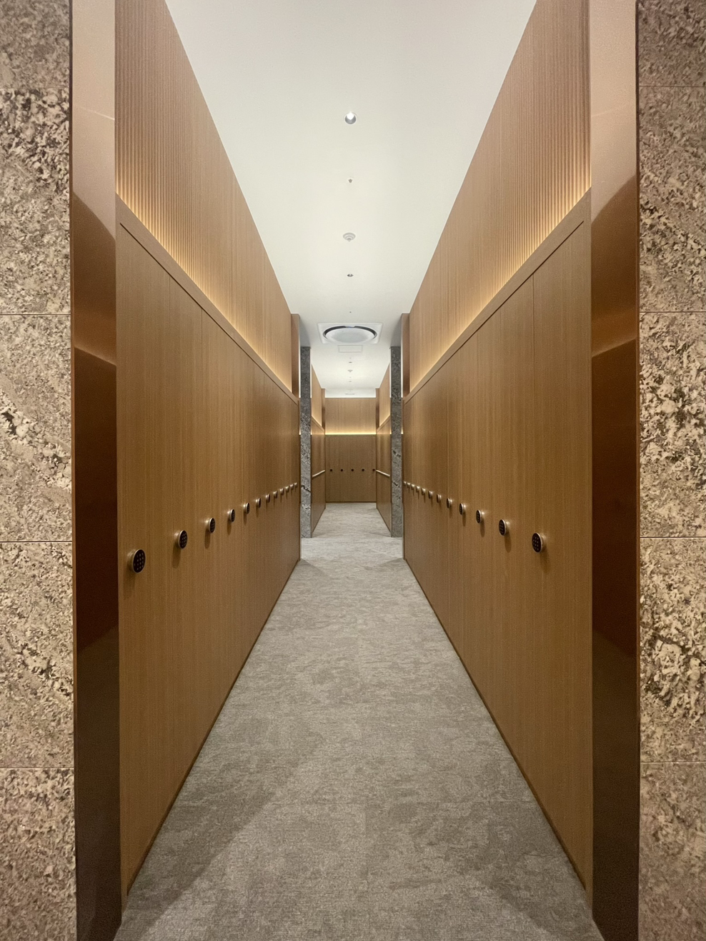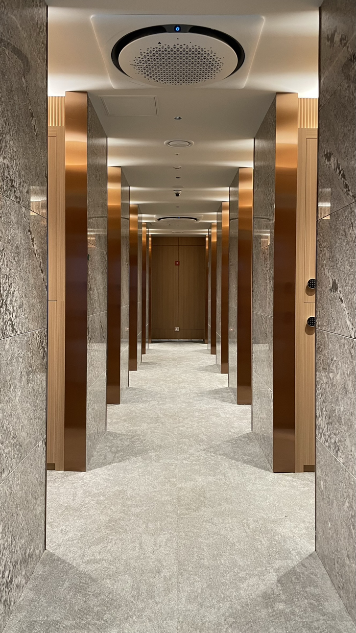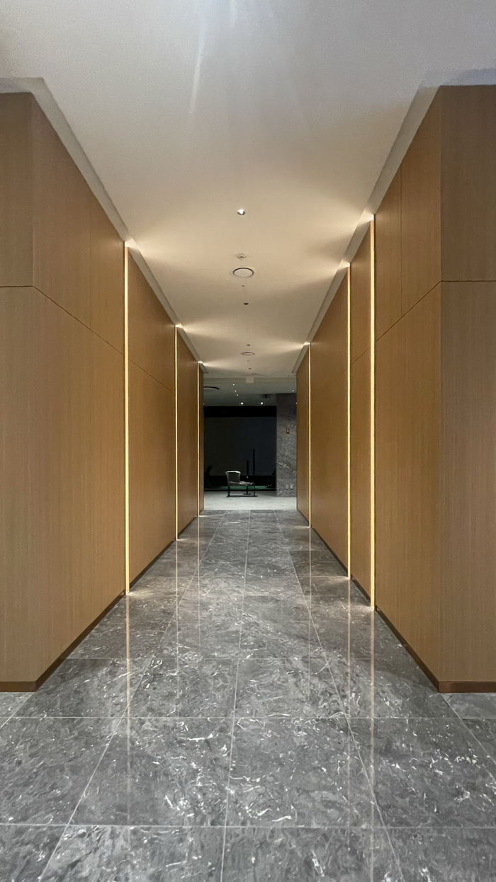 면적이 넓은 공간의 특성상 타석과 락커 등 각 공간을 연결하는 복도가 생길 수밖에 없습니다. 선큰 커튼월 밖에서 바라보는 복도가 파사드 요소가 될 수 있도록 세로 라인의 조명을 적용하여 웰컴존에서 골프락커로 이어지는 긴 복도의 벽면에 수직라인 간접조명을 적용하였습니다. 랜덤 간격으로 설치한 조명라인은 복도의 단조로움을 해소할 뿐 아니라 사용자에게는 <나 따라와, 락커로 이동하는 길이야>라며 자연스럽게 길을 안내하는 시그널을 주고 있습니다. 다소 지루할 수 도 있는 긴 복도는 그 벽을 따라가노라면 락커존으로 이동하는 짧은 순간에도 명상의 무드를 제공하고 있습니다. 골프의 특성상 집중력이 요구되는 만큼, 시합에서 선수가 샷을 하기 전 숨죽이며 기다려주는 갤러리들을 닮은 공간의 무드 덕분에 일명 갤러리로드로 부르고 있습니다..