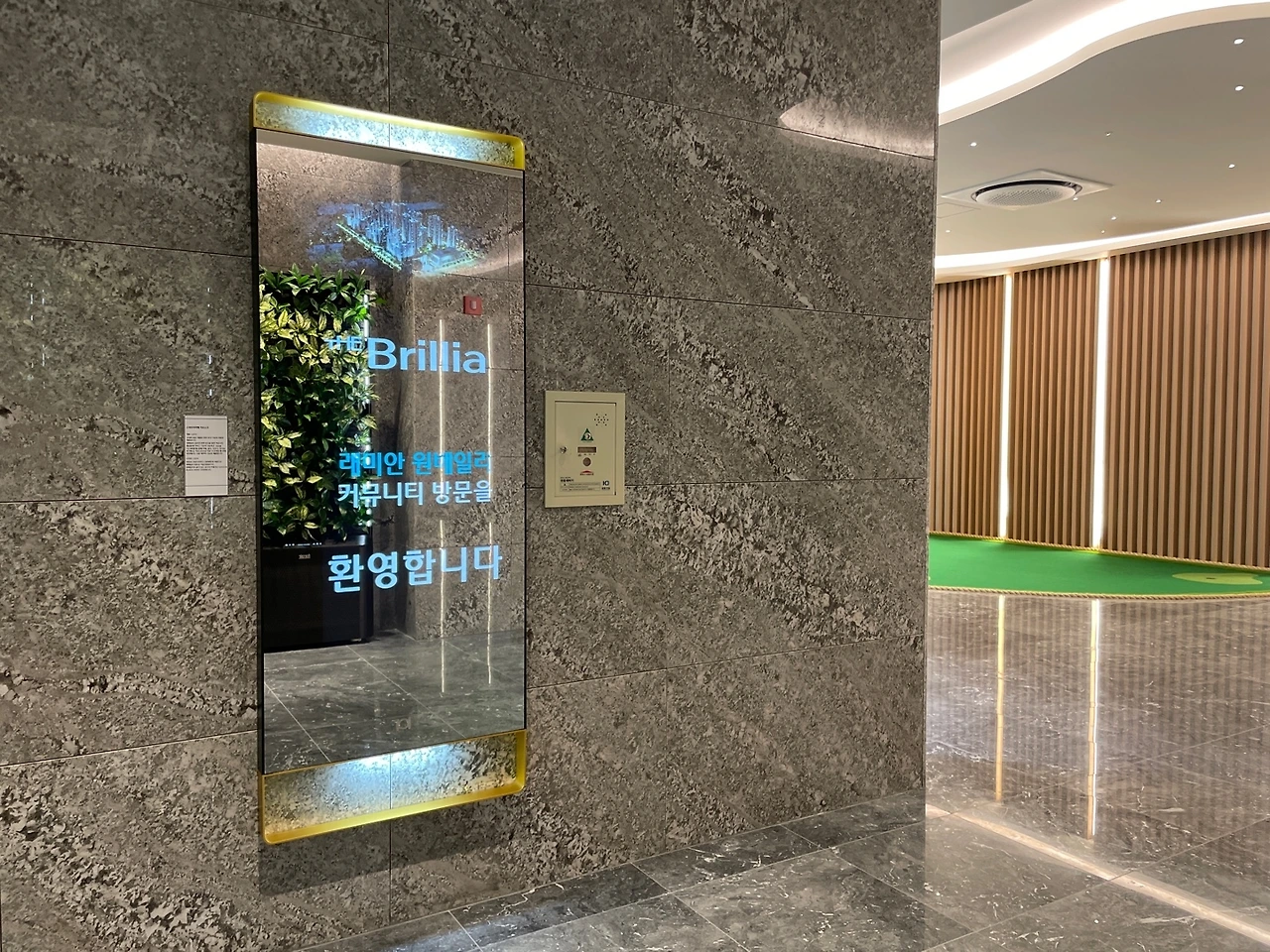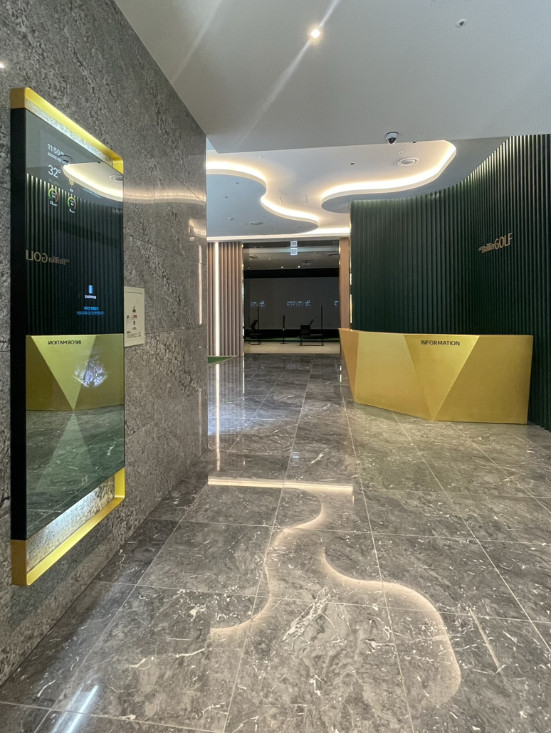 골프시설에 들어서면 입구 쪽 선큰뷰로 웰컴존을 배치하였고 이곳에 들어서면 그린재킷을 상징하는 그린컬러 벽을 마주할 수 있으며 입주자에게 최고의 예우를 담아 환대하는 의미를 담은 일명 그린재킷월입니다.