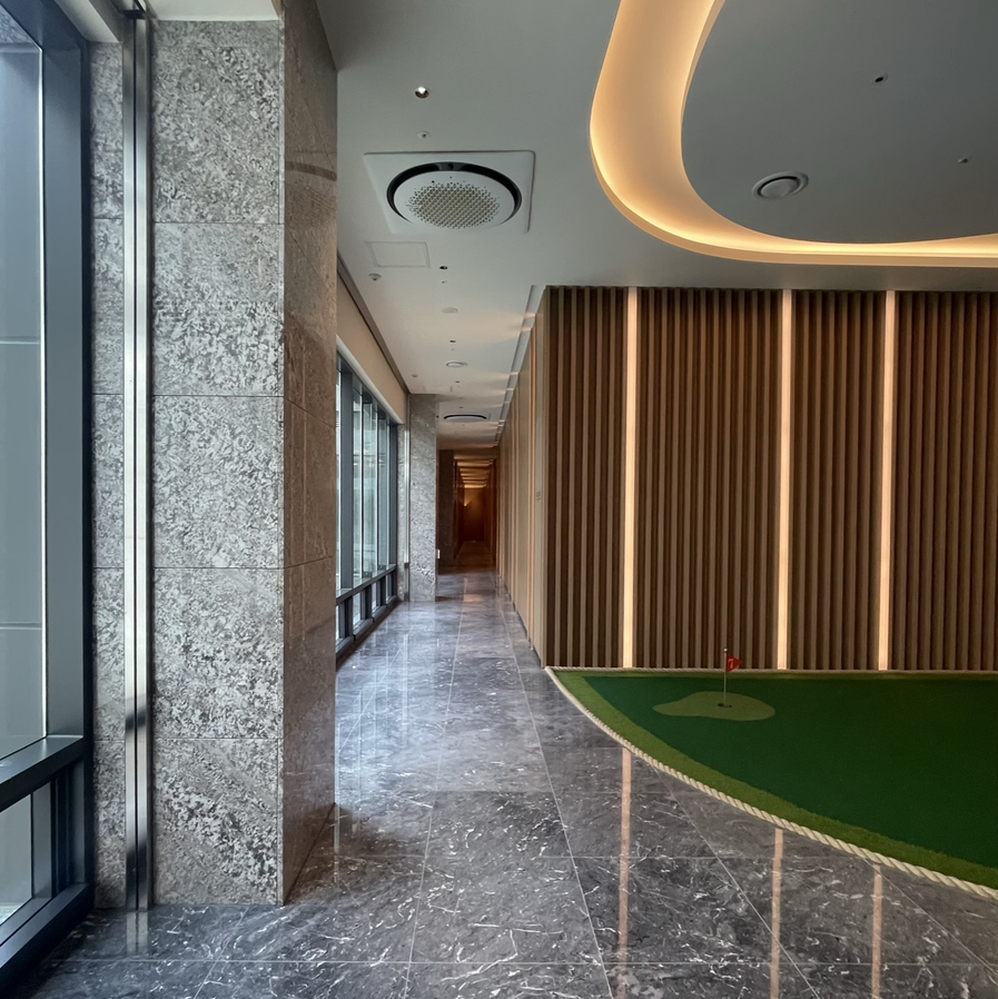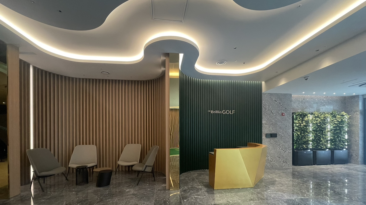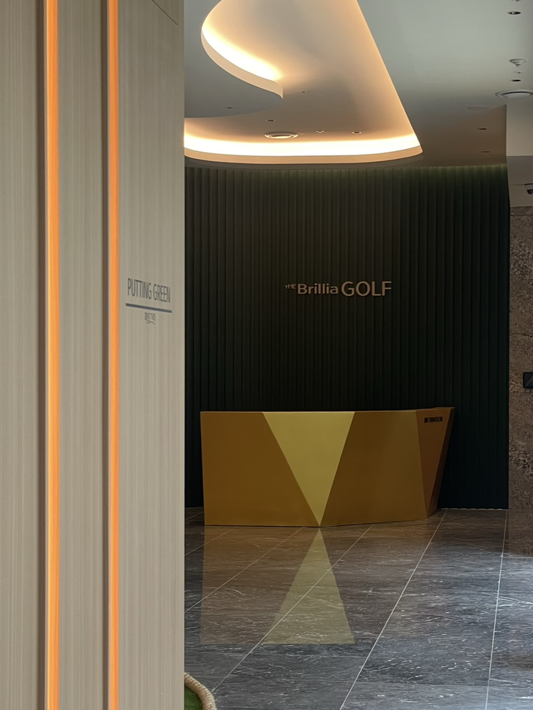 웰컴존의 유선형의 벽과 천장, 퍼팅그린, 라운지의 커브드월은 골프장의 페어웨이를 형상화한 디자인이자