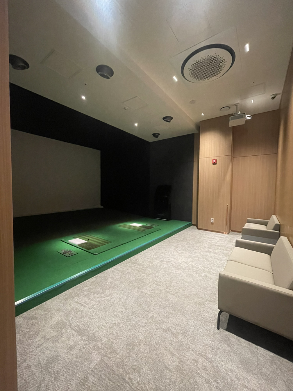 27개의 스크린타석 중 2개소는 왼손잡이 사용이 가능한 좌우타석입니다. 전타석에 골프존 GDR을 설치했고, 타석의 비거리는 타 단지에 비해 약 60 센티미터 더 길게 설계되어 타격감을 더 증진시킬 것입니다. 3개의 스크린골프타석은 모두 좌우타석으로 왼손잡이도 고려하였습니다.