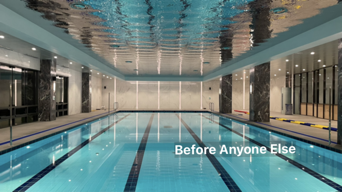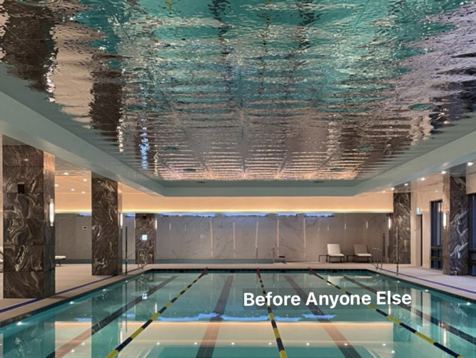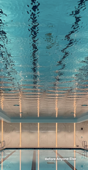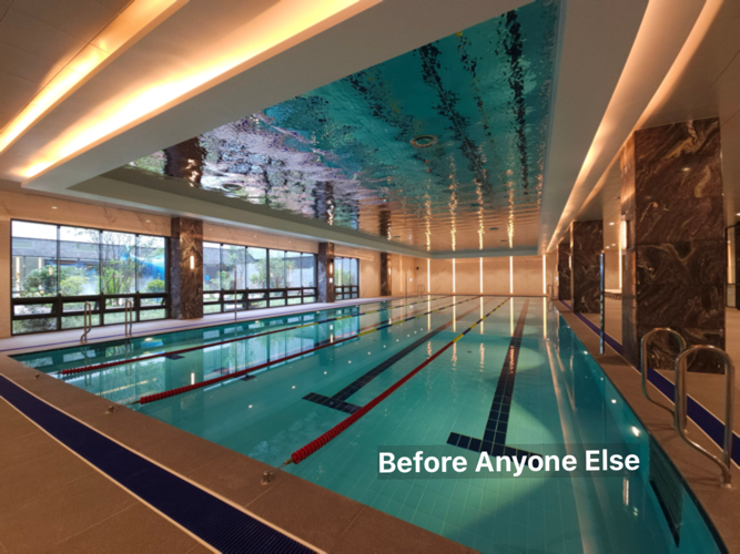 원베일리 수영장은 천정은 지중해 바다와 닮았습니다. 거울 효과를 품고 있는 천정재에 수중조명으로 밝아진 풀이 비친 천정의 모습은 상상 그 이상으로 지중해 바다를 느끼게 합니다. 빛과 거울효과의 절묘한 조합으로 지중해 바다의 윤슬과 에머럴드 컬러 바다가 원베일리 수영장 안으로 들어온 듯 매혹적입니다.